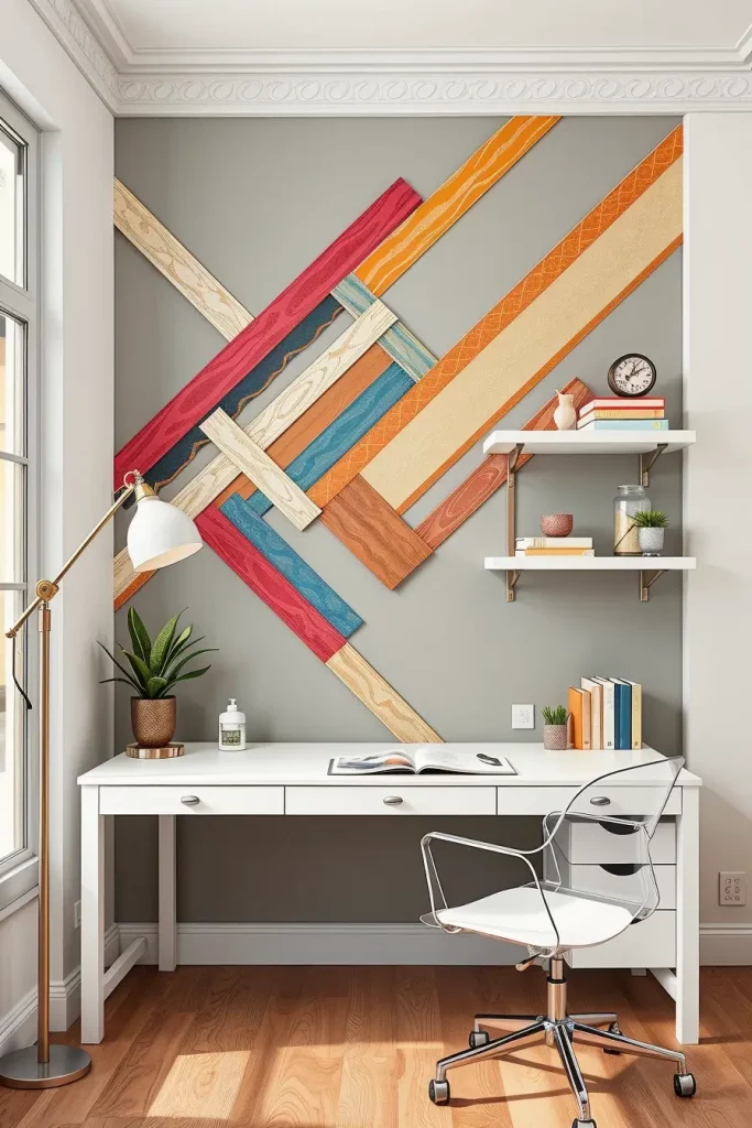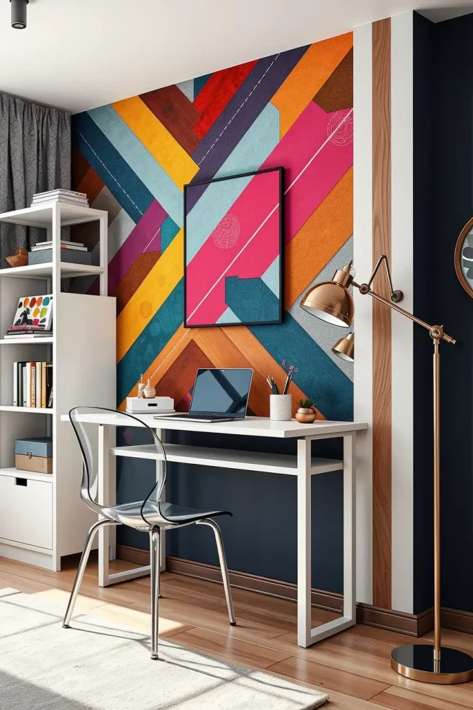Geometric tape art includes colorful and contemporary designs that make home offices, kids’ rooms or studios come alive. Peel and stick is very helpful for making anything on walls look creative, without needing to worry about wallpaper or holes.