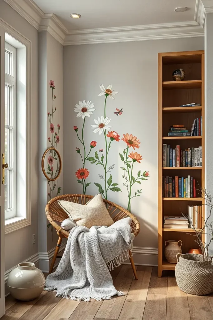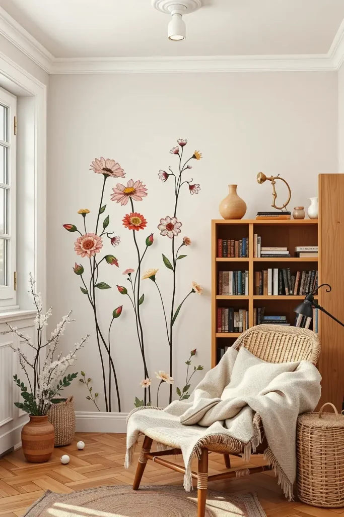 You can easily make patterns like Moroccan tiles, florals or mandalas by using laser-cut stencils and reusable wall-safe paint. Foam rolling allows you to apply the makeup without leaving streaks. A mix of Scandinavian and transitional ways in design helps this style to be down-to-earth and full of character. I set it up using oak pieces, some black metal accents and soft fabrics so the artwork’s detail isn’t overpowering.