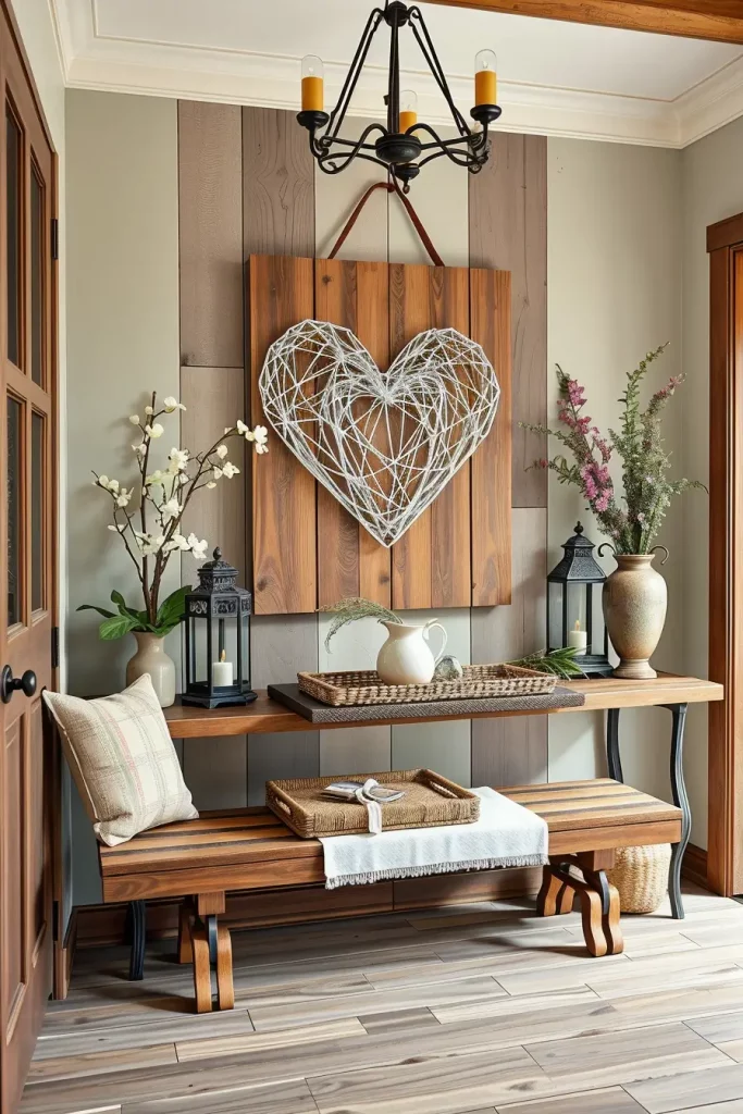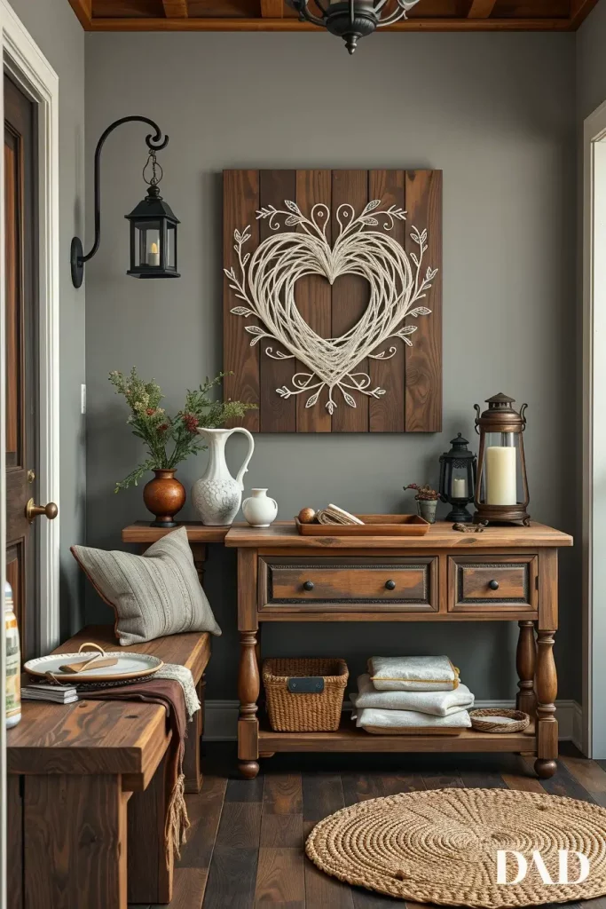 I begin by staining wood panels brown or gray, add small nails and then cut out hearts, state shapes or words with embroidery thread. The whole process is rewarding and you end up with something original and appealing. These types of wall art are best fitted above a vintage console table decorated with old lanterns, a vase and a tray for your mail or keys.