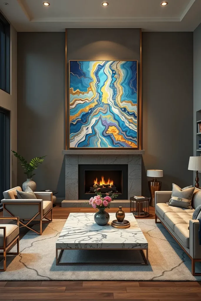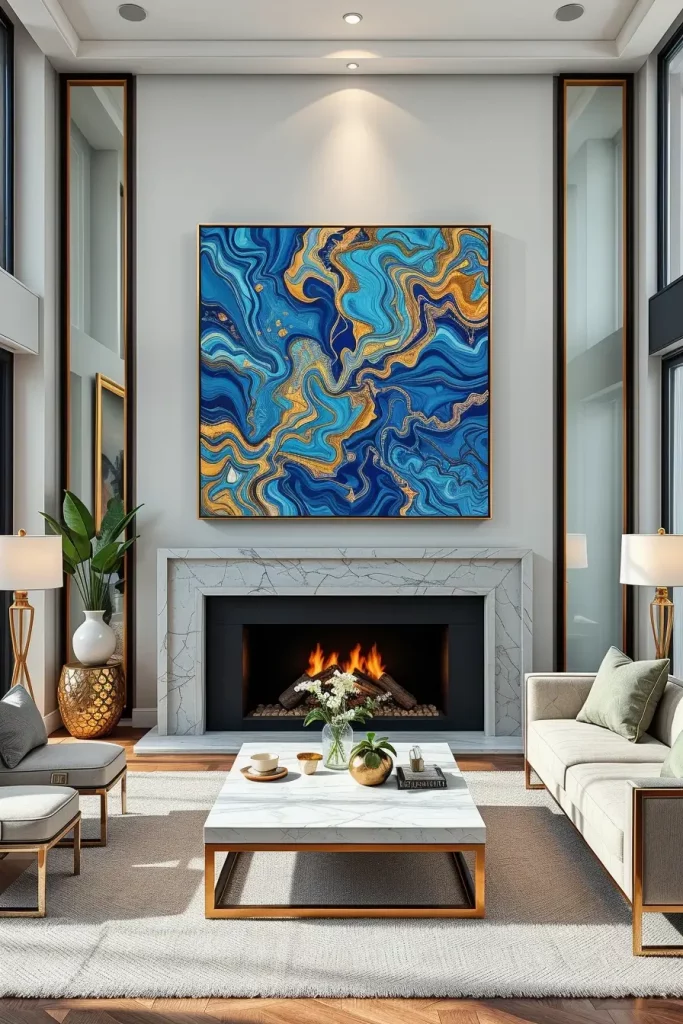 Abstract acrylic paintings are easy to do and a great way to make any blank spot more interesting and exciting. I often advise using this technique for modern or transitional spaces since it goes well with bold visuals and open floor plans. Over a fireplace mantel or a high ceiling, a large pour painting can really create a striking impression in a living room.