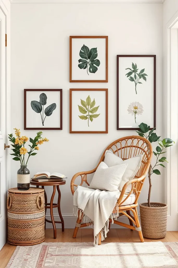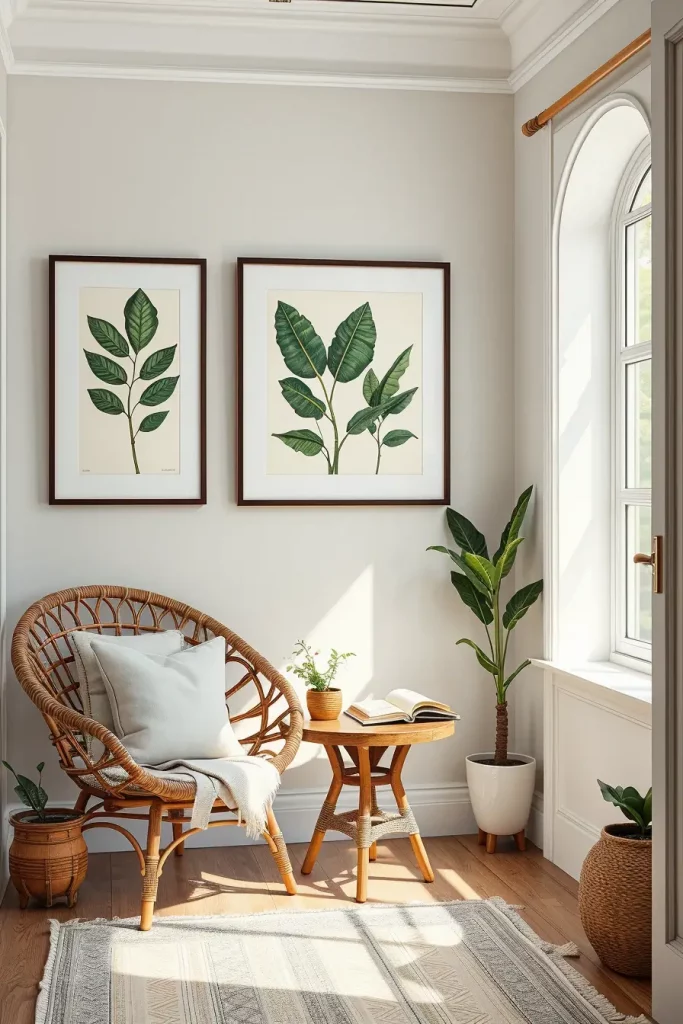 I pick some fresh ferns, eucalyptus or maple leaves, press them, paint acrylics over them and print the design on thick watercolor paper. The finished prints turn out to be soft and very appealing to see. I like to put them into black metal frames that have wide matting to give them a more elegant appearance. A rattan armchair, side table and set of linen pillows are included to match the natural feel in the patterns.