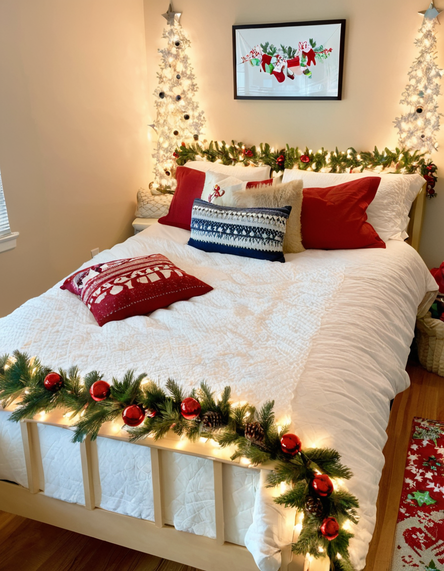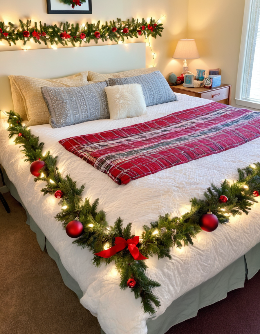 One quick and smart way to whirl a holiday spirit at your dorm room is bedframe decor and that just wraps that bad boy with a garland. You can either go with a classic pine garland or try out a different metal or DIY look with options such as snowflakes, bells, or candy canes. Give your bed the celestial vibes from Christmas lighting and it would look like you have built the heaven of your own during the holiday days.