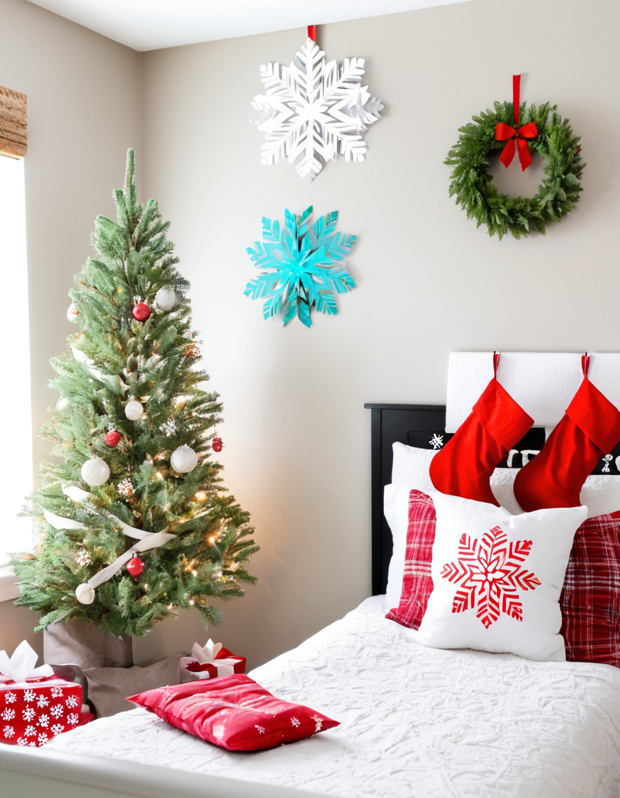 To give your dorm a wintery, magical feel, get snowflake-themed decorations. Tie paper snowflakes to the ceiling, attach snowflake-shaped string lights on your door, or utilize window snowflake stickers. These garnishes are both incredibly straightforward and yet effective in creating such a wintry paradise in small rooms such as the dorm. Creating snowflake ornaments for your Christmas tree or implementing snowflake-patterned accessories can also be an excellent option for this purpose.