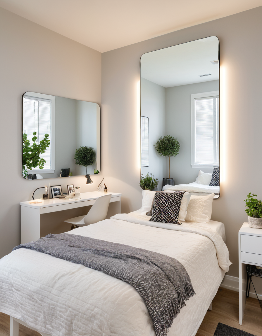 Mirrors come in very handy in tiny dormitory suites. In fact, they are not only practical but can also reflect light and with the help of the light, give the visual illusion of more space. You can install one big wall mirror or a cluster of smaller mirrors around the wall to make space appear amid in the room. To make the mirrors part of, not just the room, but the extension of the art, select those with stylish frames that match the overall theme of your room’s décor, for example, basic and preppy.