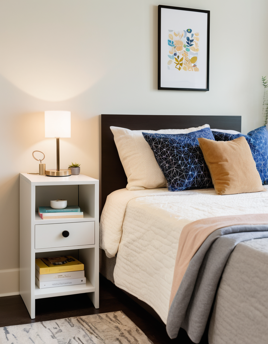 A bedside table may be another addition to the dorm room which is both functional and stylish. It is set on a pivoting base that will intersect storage and decorative tasks such as books, possibly phone, or a stylish source of light, and additionally will give access to essential daily stuff. You may also consider using the table with built-in drawers and shelves to keep your bedroom items organized at night. This is a simple piece of furniture that has a double function, being practical and helping to overall the polished look of your dorm room.