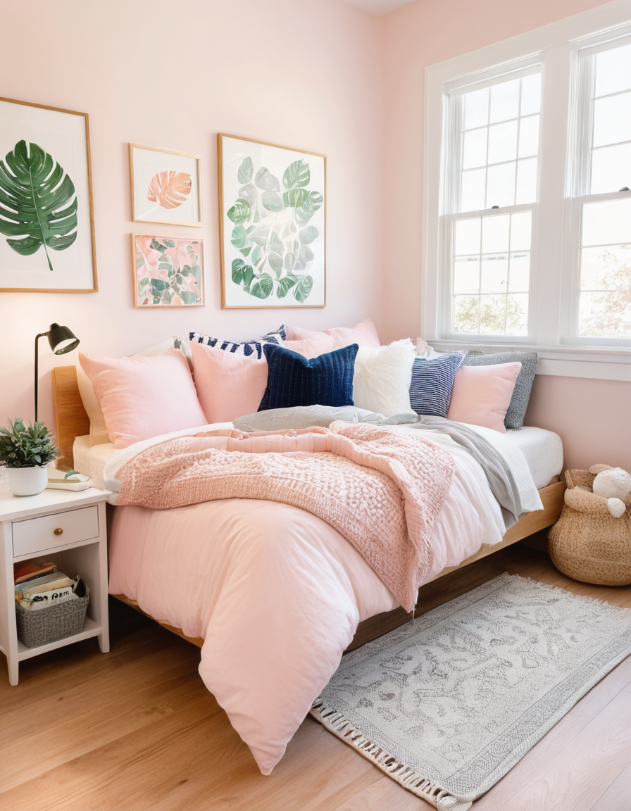 Your bed is the most important part of your dorm room so choose something that matches your style and personality. The addition of soft textures and minimalist accent walls in light and pink shades adds a lot of visual and psychological tranquility. The idea of a more casual and cheerier room will be completed by introducing the tropical theme with throw pillows and blankets. Purchase the long-lasting branded items that offer the best value to secure you through your time in school.