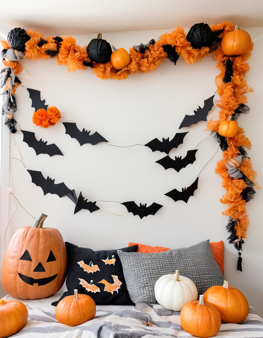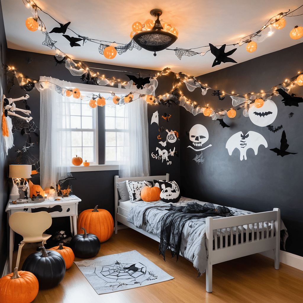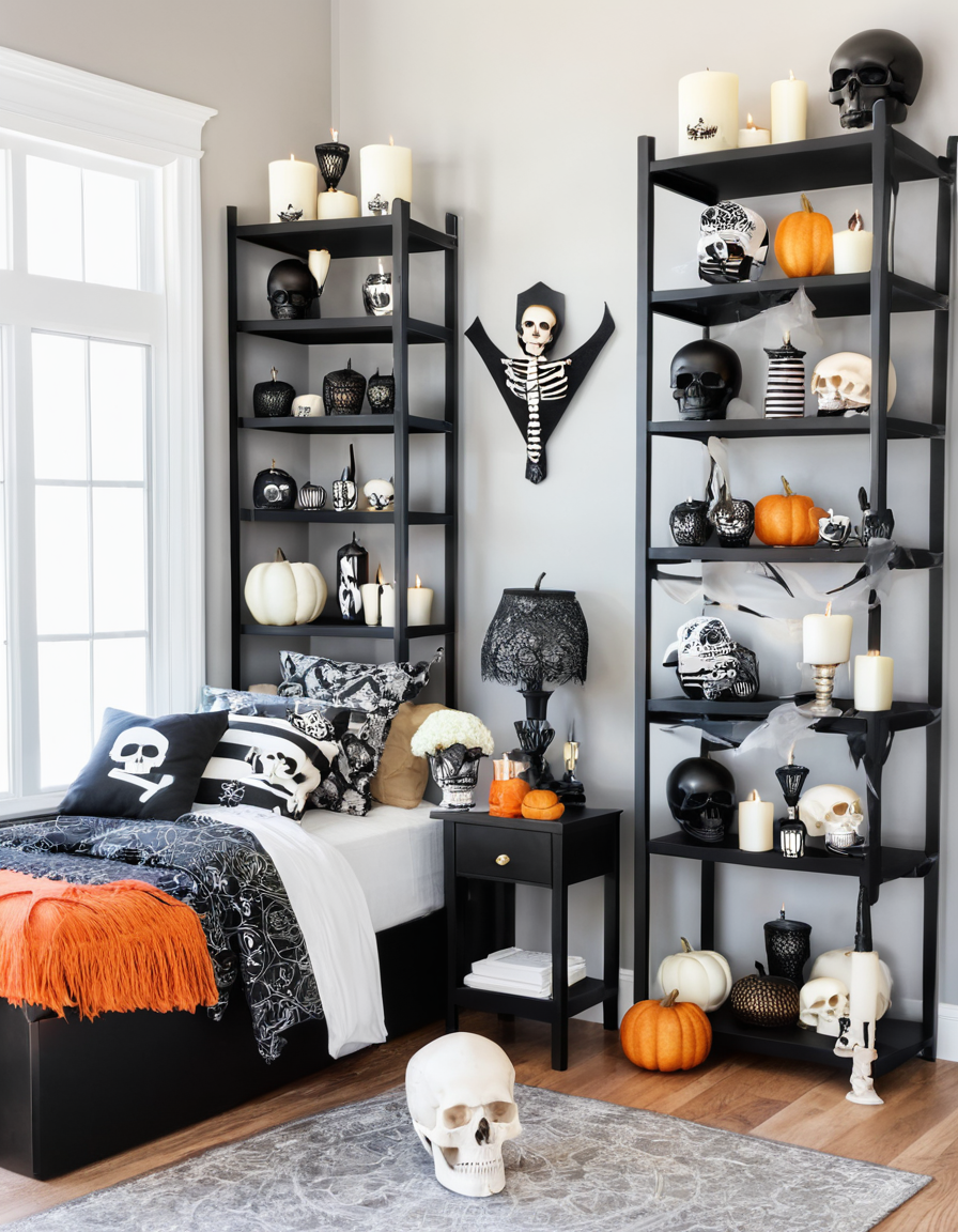 The inevitable Halloween symbols that have always been associated with the notorious &,quot;skellets” and the creepy “skulls” are now part of the main decorations in your dorm room. You can use small skull figurines on your desk, bookshelf, or window sill that bring a horror atmosphere. You might consider the effect of overdoing the decoration by including lifesize skeletons or having a beautiful skeleton garland and how it can make the place come to life. Furthermore, you can opt for skull-shaped candles, or for the pillows with skull print as add-ons to your bedding in morbid shades.