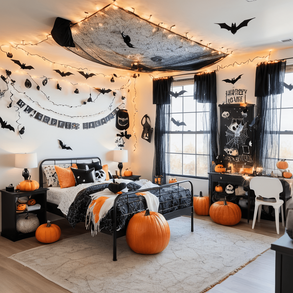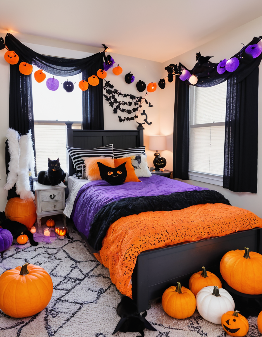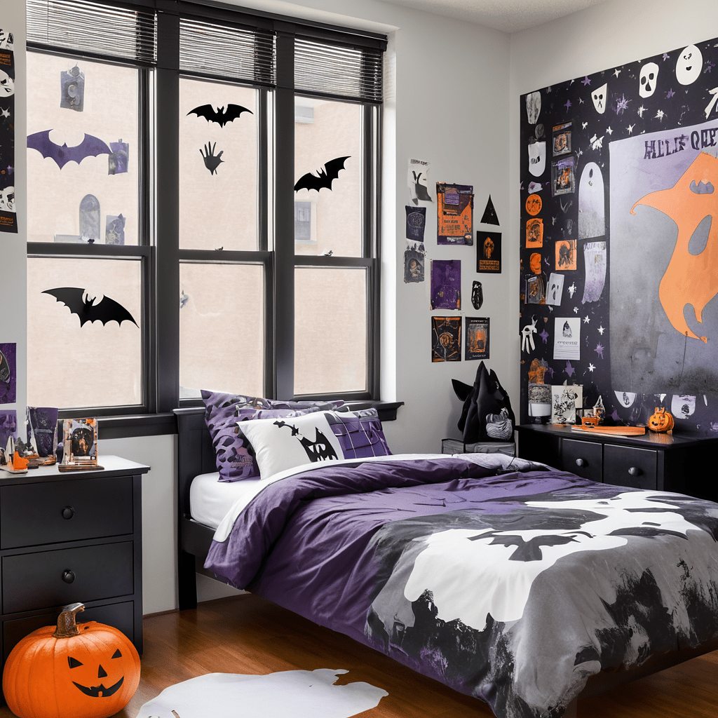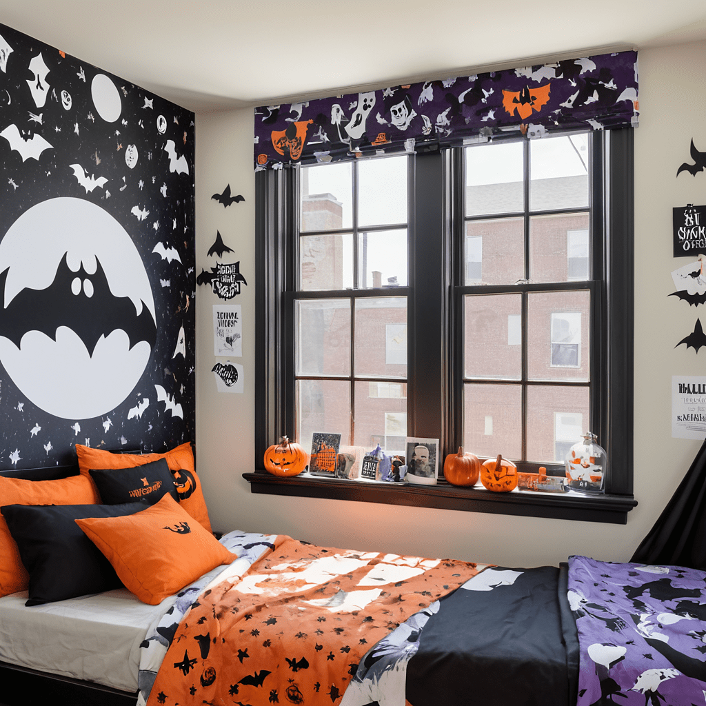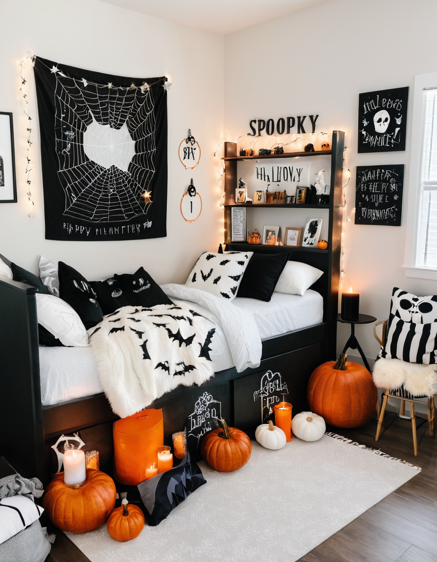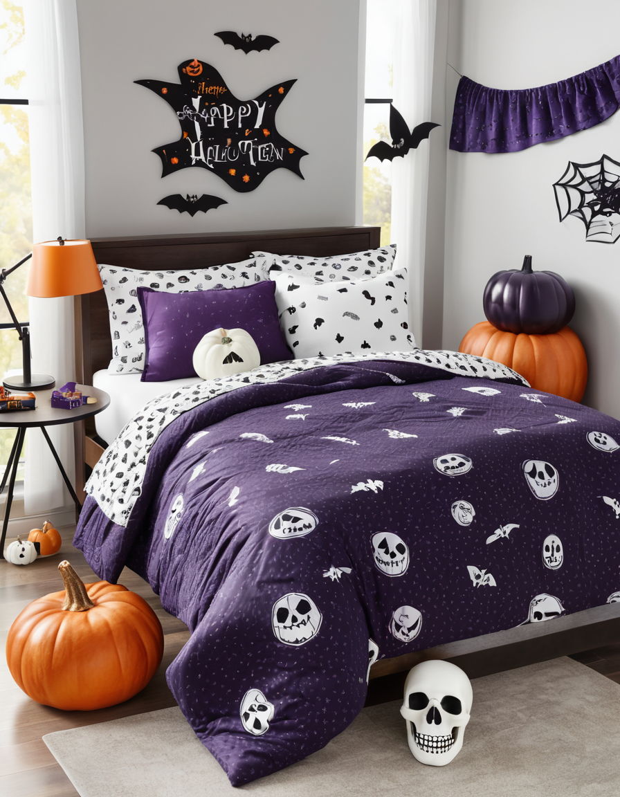 Halloween-inspired bed linen and pillows are the appropriate answer to the question of Halloween. Get pillows and blankets with prints of pumpkin faces, skeletons, or witches to put the feathery, festive glow to the dormitory bed. beddings in devilish, dark colors such as black, purple, and blood-red can also be a good option for decorating the room with haunted aesthetics. In addition, add some of the extra blankets you will find with various charming ghosts or bats on them to get the final look.