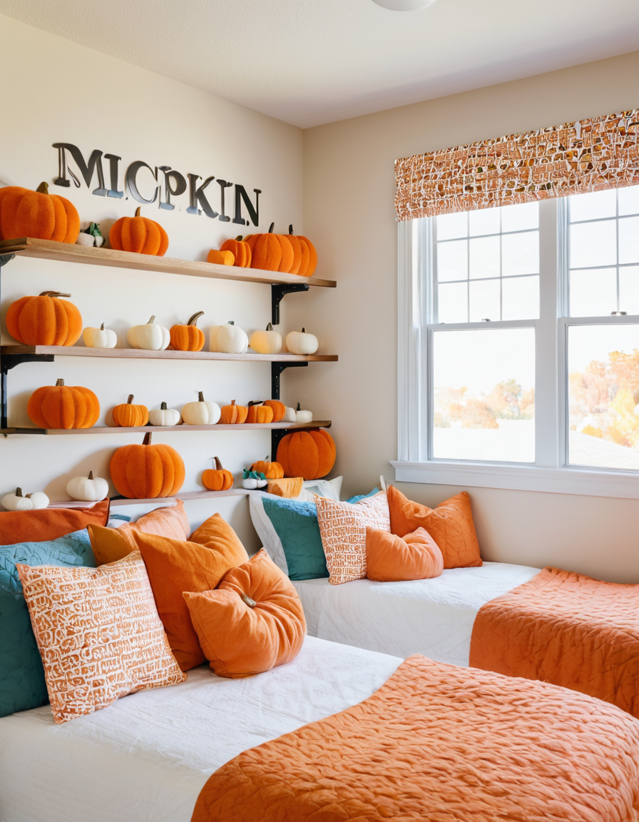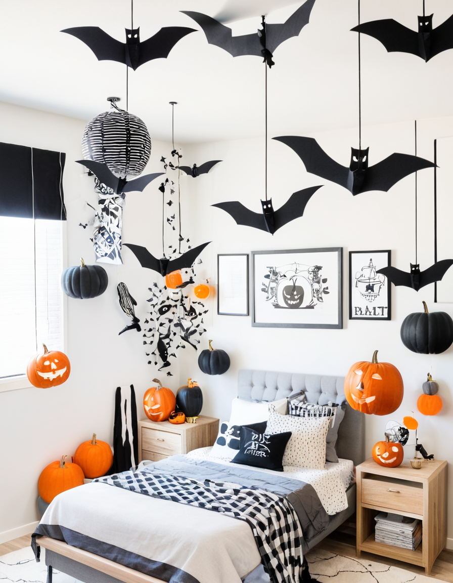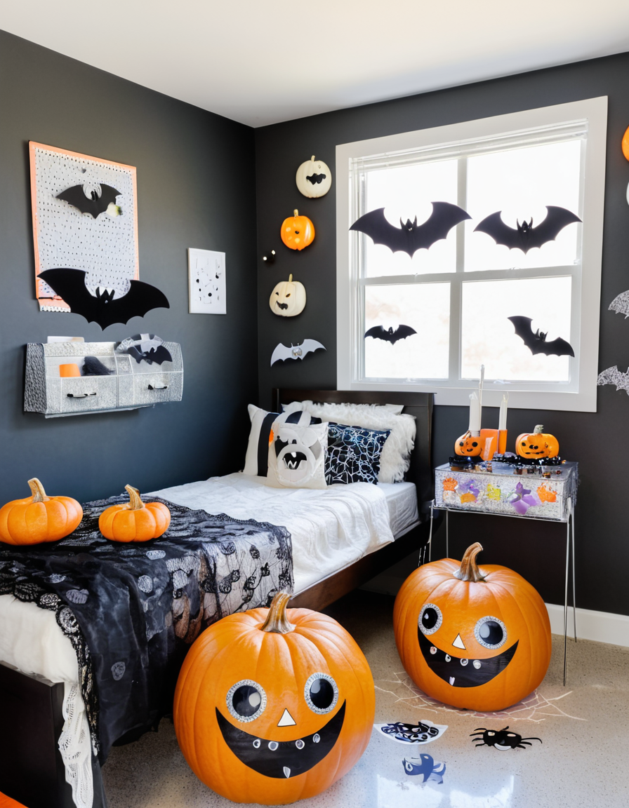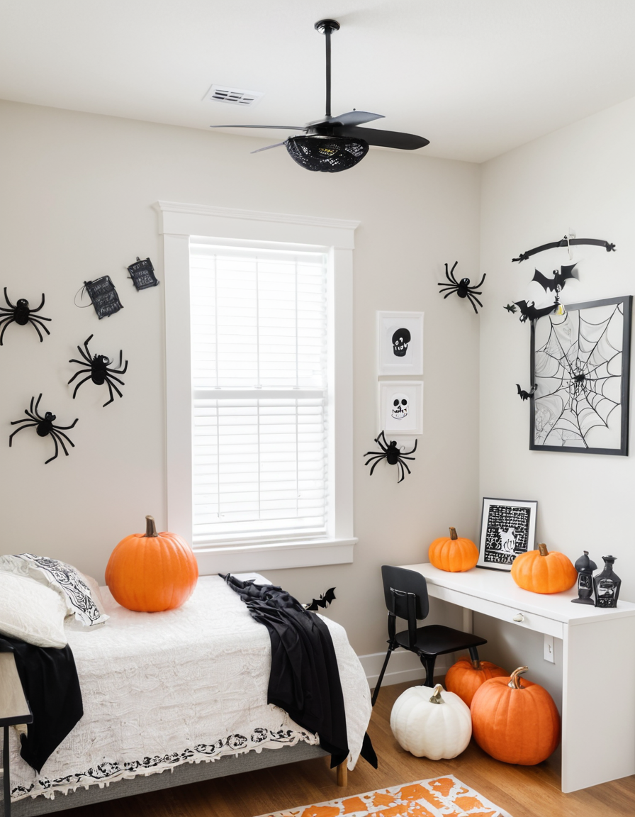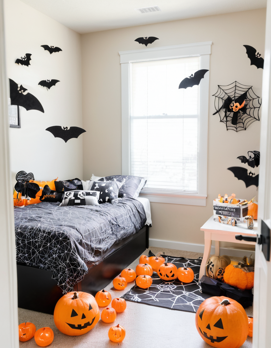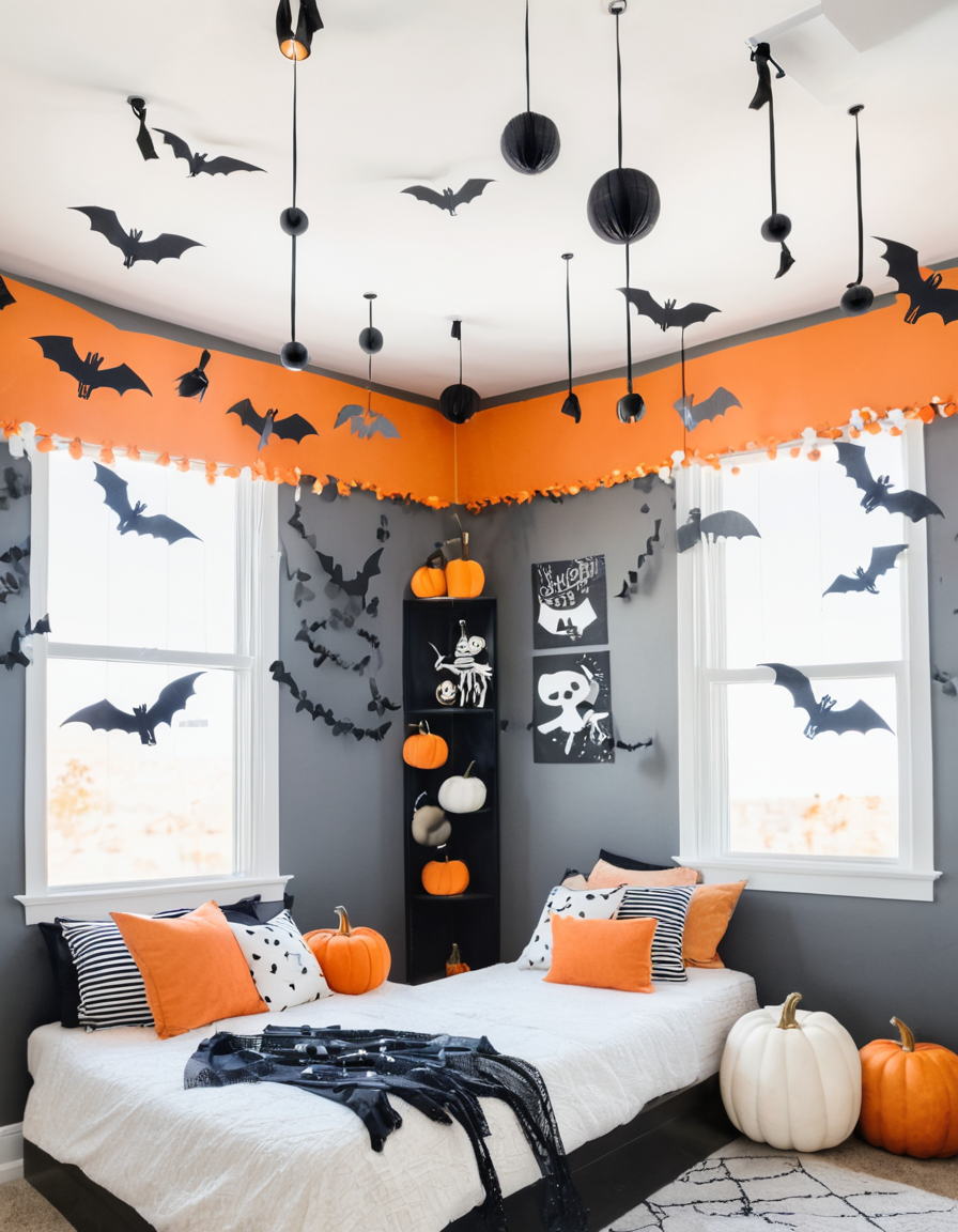Halloween-inspired bed linen and pillows are the appropriate answer to the question of Halloween. Get pillows and blankets with prints of pumpkin faces, skeletons, or witches to put the feathery, festive glow to the dormitory bed. beddings in devilish, dark colors such as black, purple, and blood-red can also be a good option for decorating the room with haunted aesthetics. In addition, add some of the extra blankets you will find with various charming ghosts or bats on them to get the final look.