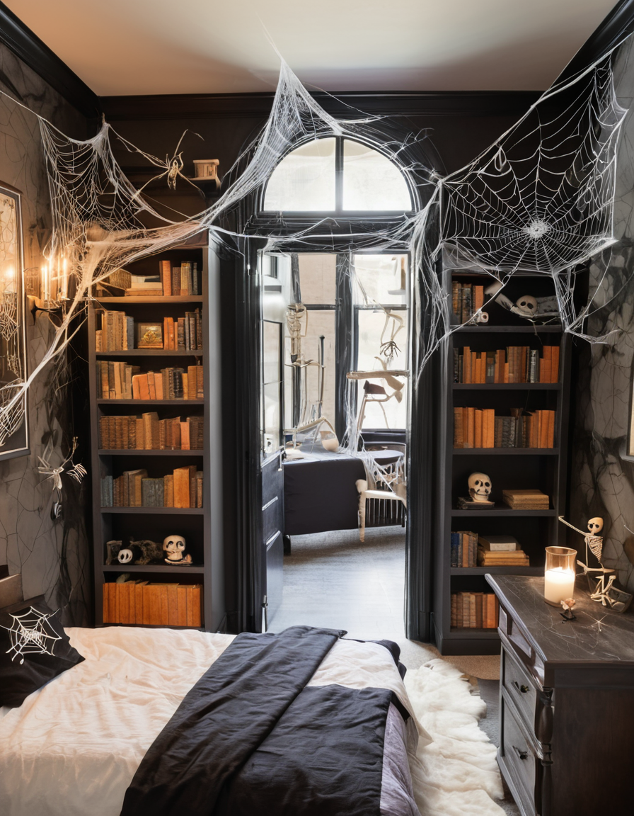 Why not turn your closet into a Halloween themed space that will scare anyone who opens it? Use fake spiders, cobwebs, and spooky decals for interior decorations, so that each time the door is open, you are facing a scary scene. Place cobwebs in the darker corners of your room and hang skeletons or ghosts from the closet bar to create a spookier atmosphere. It becomes a creative way of giving the Halloween season its due without dispersing too much of your main living space and you get to take the haunted corner to the dimension of unity not to the division of perplex your pals with.