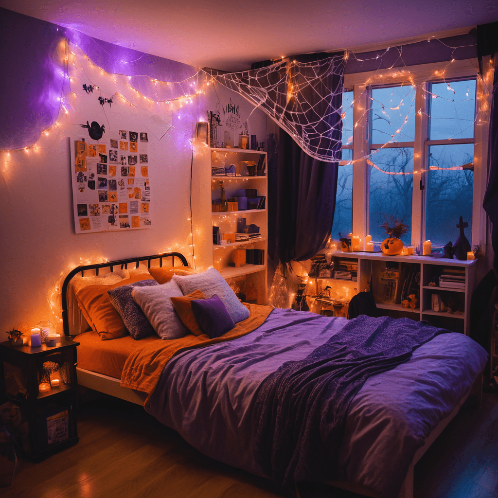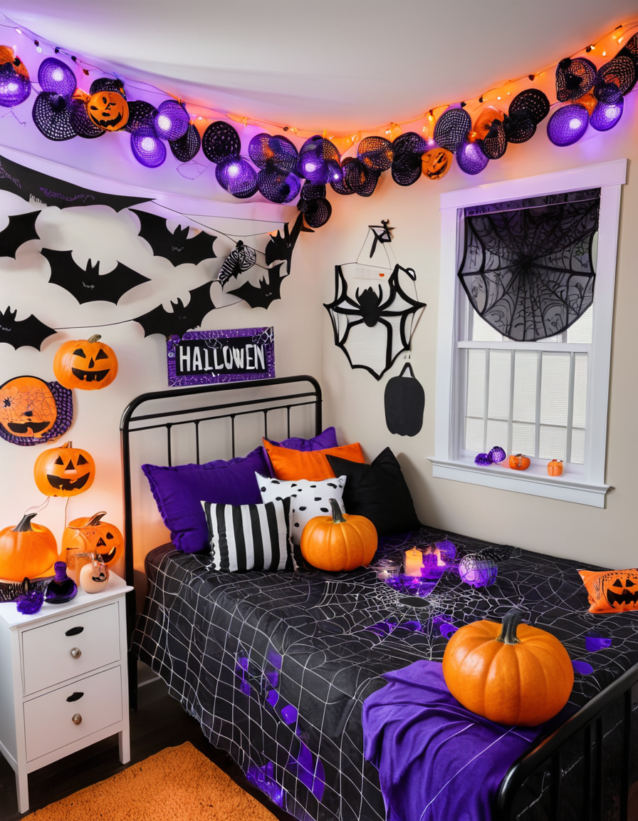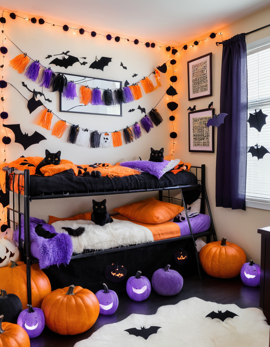 One of the simplest ideas for celebrating Halloween in your dorm is to add the traditional holiday colors of black, orange, and purple to your existing decor. Replacing ordinary pieces like pillow covers, rugs, or curtains with scoped colored prances. Decorate with touches like candles, lights, and garlands that are designed in pumpkin, black, and purple, respectively, to make the transition to the scary decor much easier while staying in the tone of what you already have. This method gives a sense of playfulness but at the same time keeps the space from looking too busy and is, hence perfect for dorm rooms with limited areas to decorate.
