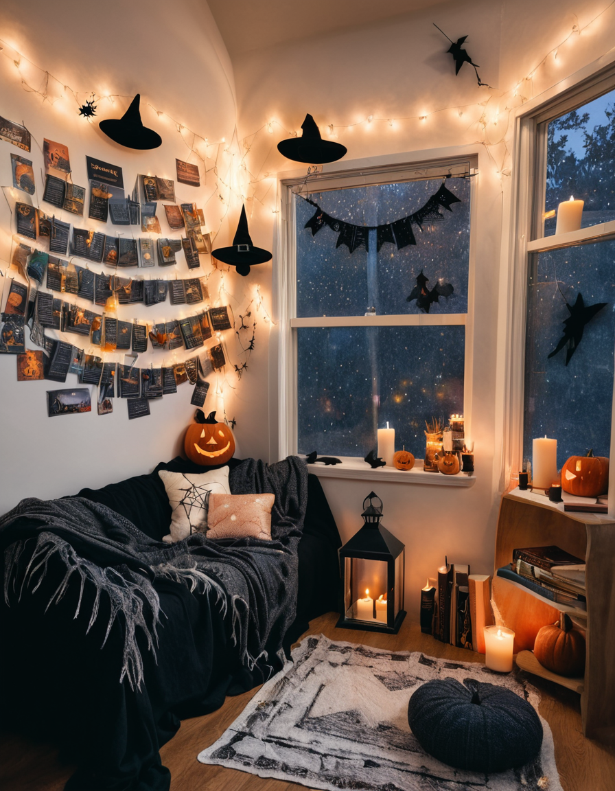 Put up a reading nook in your dorm that is torn between coziness and eeriness with the help of low lighting and themed decorations that are meant to be spooky. Include a cozy chair, large pillow, and some dark blankets as the backdrop for a reading spot in a corner of your room. Drape dimmest fairy lights or battery-operated candles on the walls so that you could attain that haunting niche vibe. You could put some horror books or spell books in the reading nook as well. Personalize the space further by hanging a witch’s hat or using fake spider webs and black cat figurines in the adjacent space. This is a great place to sit with your Halloween-style book and get into the Halloween theme while to avoid too much lighting.