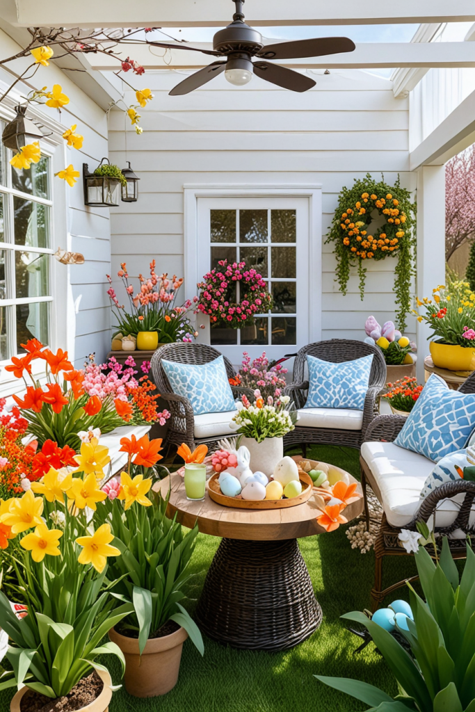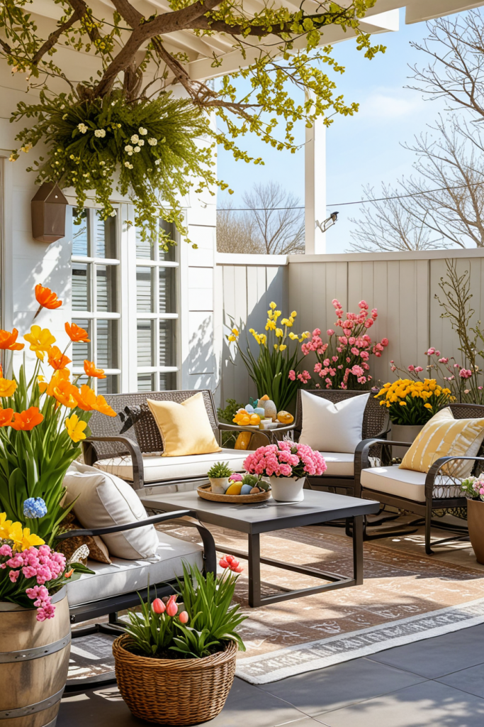 Easter outdoor themes now welcome spring with the use of colorful flowers, nature, and imaginative decor. The combination of colorful blossoms, charming ornaments, and intricately designed outdoor furniture is festive and inviting.