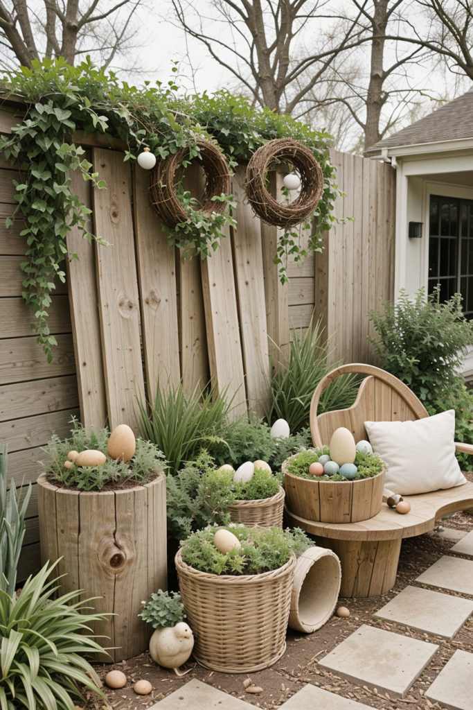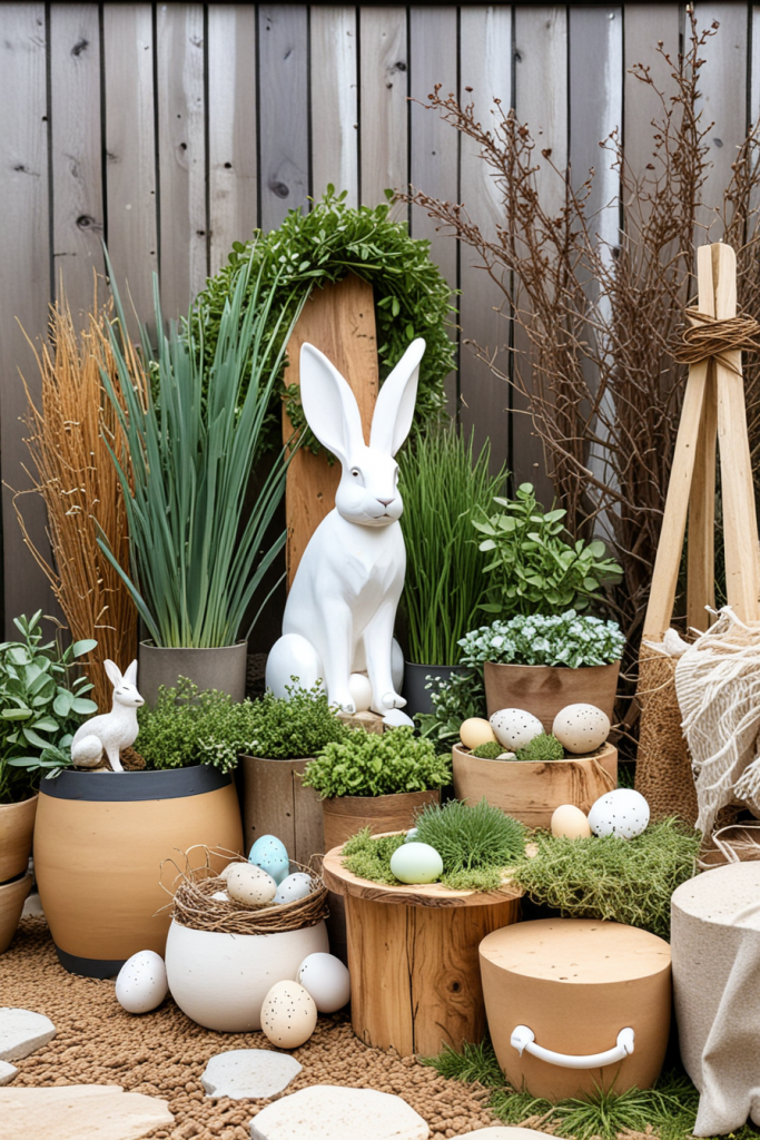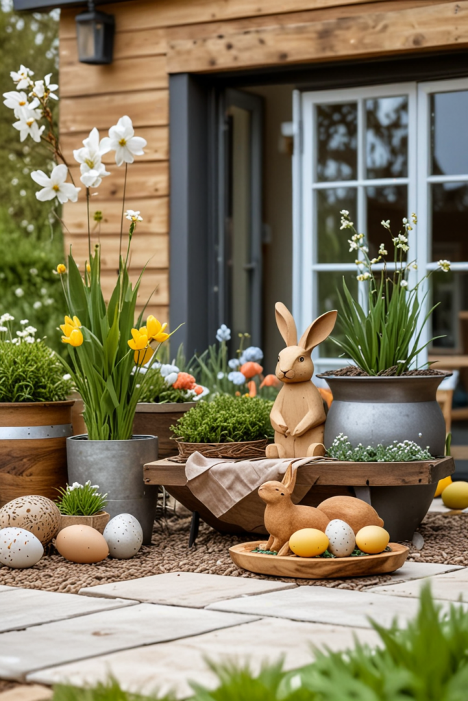Here, the emphasis is on adding natural features to your decoration for Easter, incorporating a personal touch to nature and modern design. The approach has a focus on organic texture, wooden accents, and abundant plant life. The external space becomes warm, calm, and welcoming with this style.