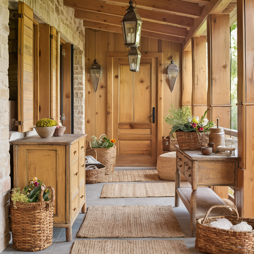 A rustic entrance hall brings a warm and welcoming feel with its use of natural materials and earthy tones. Choose wooden furniture with a distressed finish and incorporate stone or brick accents. Use warm lighting and accessories like woven baskets, vintage lanterns, and natural fiber rugs to enhance the rustic charm.