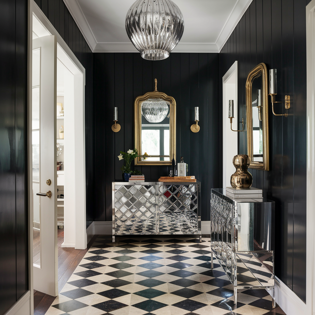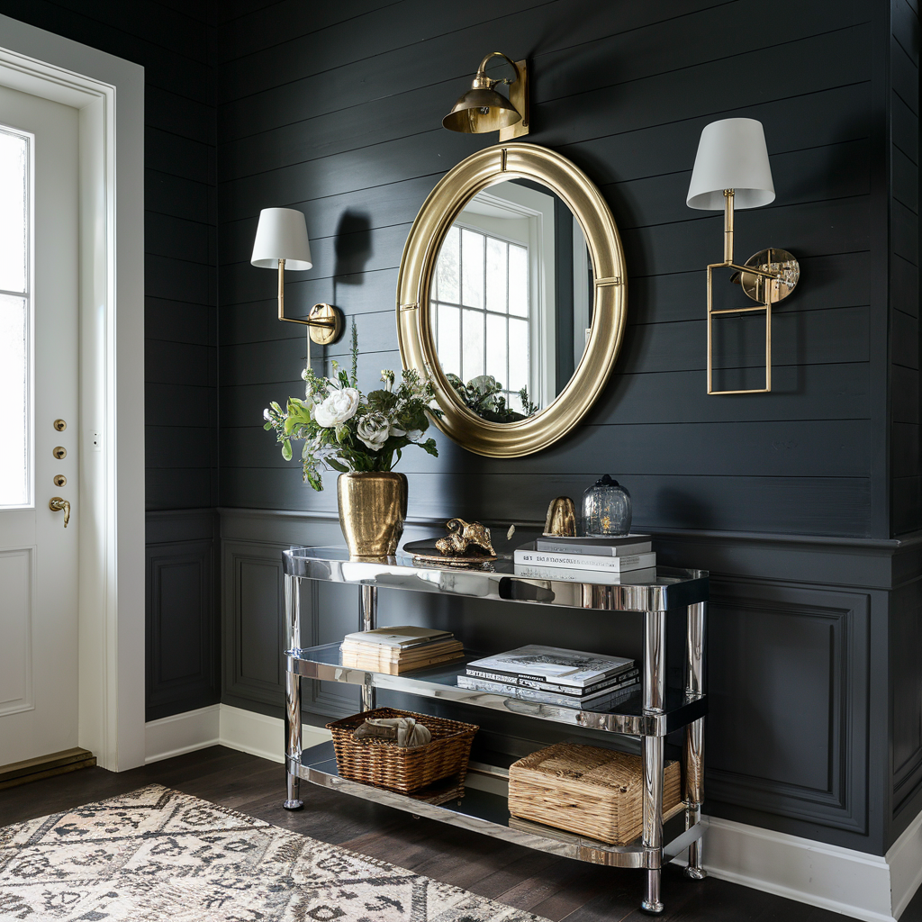 A dark-themed entrance hall can create a dramatic and sophisticated ambiance. Use deep hues like charcoal, navy, or forest green for the walls. Balance the dark tones with metallic accents, such as a brass mirror or a chrome console table. Good lighting is essential; consider statement light fixtures or strategically placed sconces to enhance the mood.
