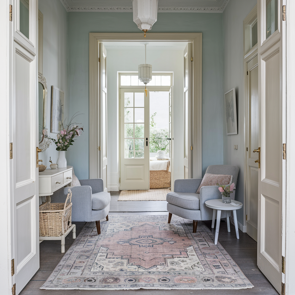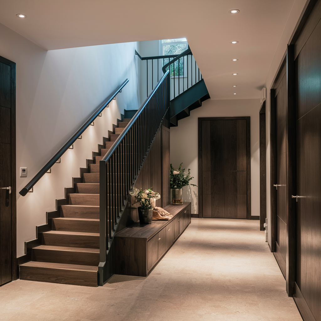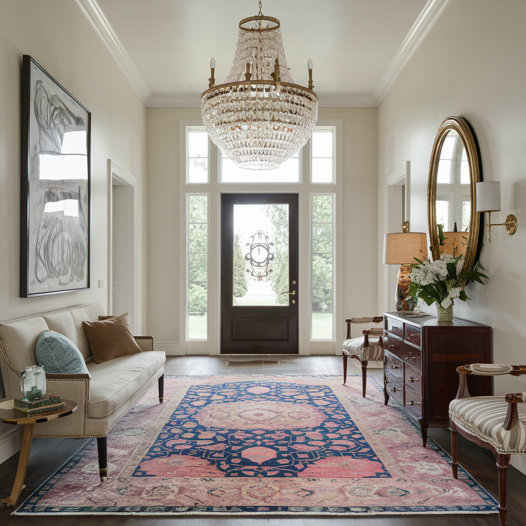 For a large entrance hall, create a welcoming atmosphere by using comfortable seating, such as a bench or armchairs. Add a statement rug to define the space and introduce warmth. Use large-scale artwork or a grand chandelier to make the area feel luxurious and well-appointed.