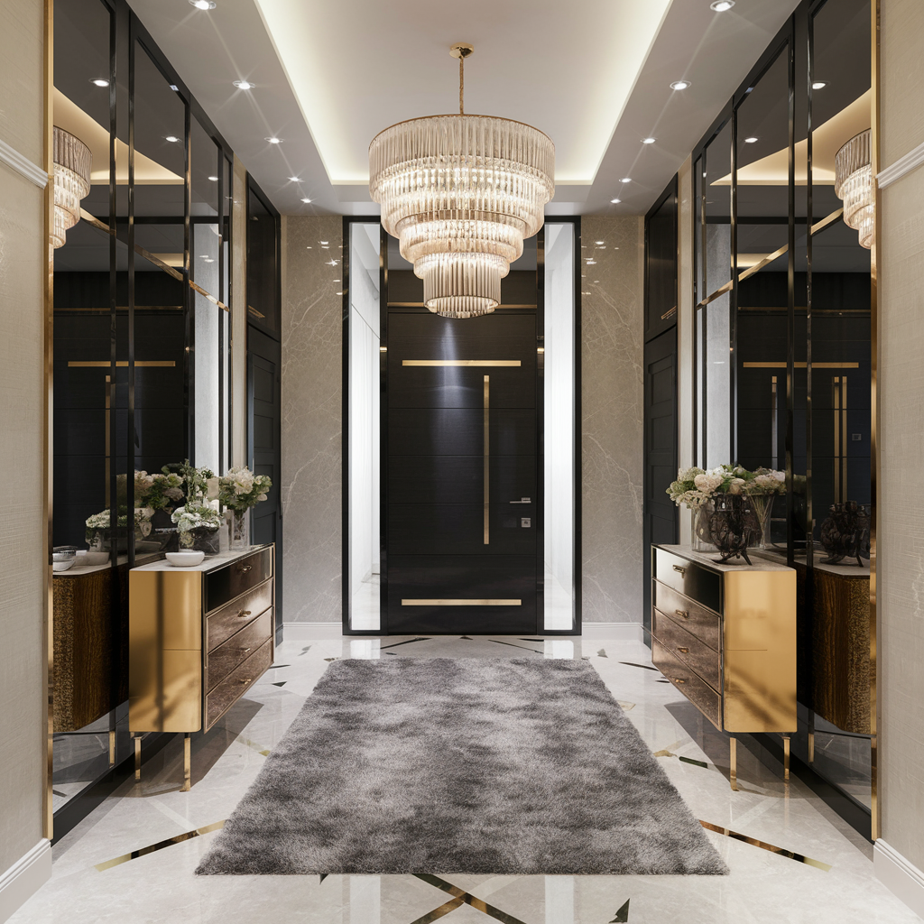 Toward the end goal of modern luxury in your entrance hall focus on top-of-the-line materials and unique designs. A statement chandelier, a plush rug, and cabinetry that you personally designed can help with this. To bring classical charm to the entrance besides marble, brass, or high-gloss surfaces are the best choices.