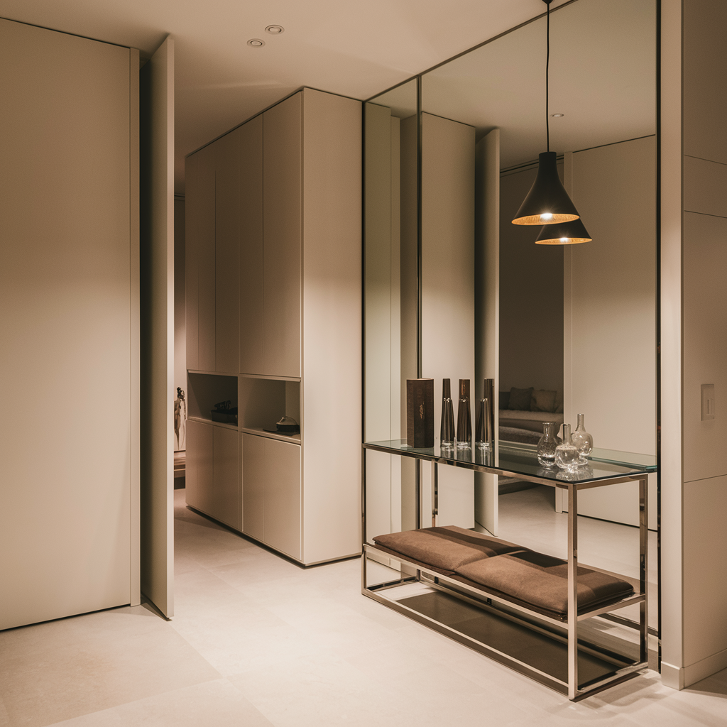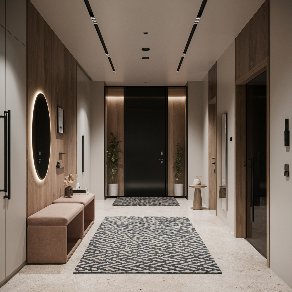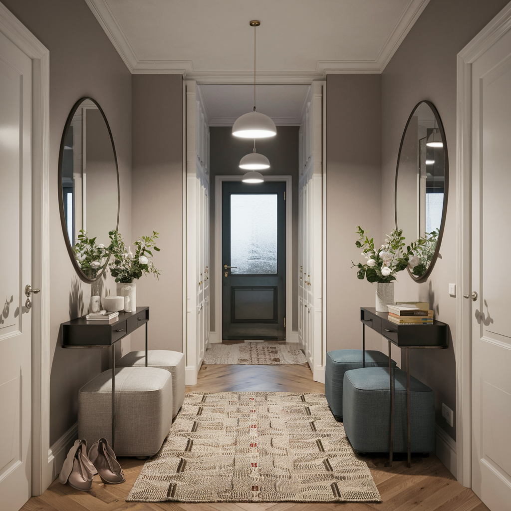 Improving a small apartment entrance hall calls for practical storage solutions and an intelligent arrangement of space. Go for multi-purpose compact furniture like shoe racks with storage or wall-mounted hooks for coats and bags. Make the room feel spacious by using mirrors for the purpose of light reflection and the use of soft, gentle colors to keep the room light and bright.