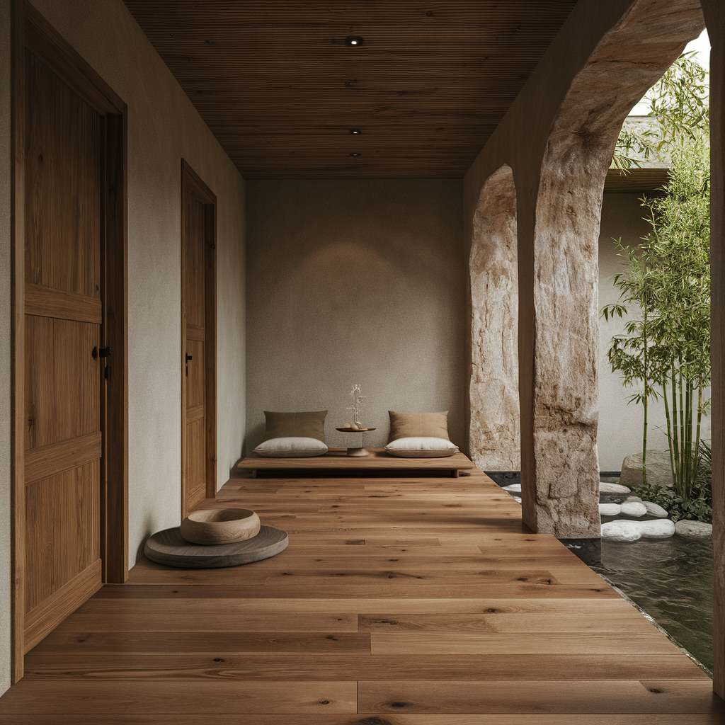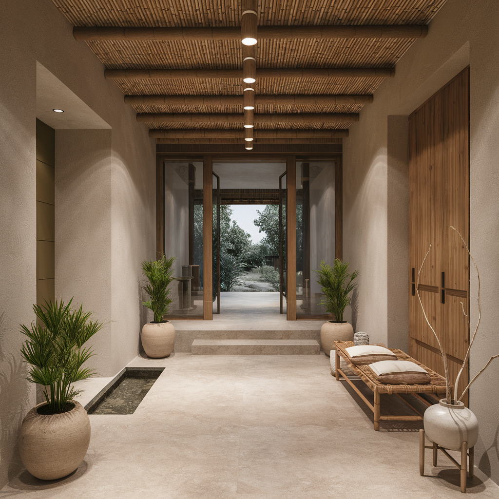 Creating a Zen retreat in your entrance hall involves simplicity and natural elements. Use a neutral color palette with calming tones like beige, taupe, and soft greens. Incorporate natural materials such as wood, stone, and bamboo. Minimalistic furniture, a small water feature, and potted plants can enhance the tranquil atmosphere.