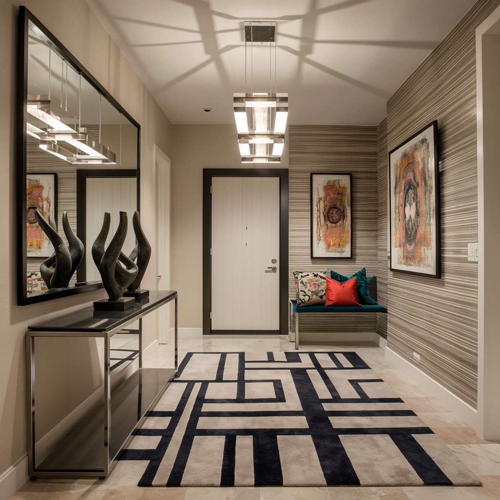 For a modern interior design approach, go for trendy decor setting that is a blend of style and functionality. A fashionable console table parallel to a mirror and some geometric patterns can be used for enhancing the eclectic design of the hall. Notice how the neutral shades go well with light accents as vivid bursts of tones sighted throughout add magic to the atmosphere.