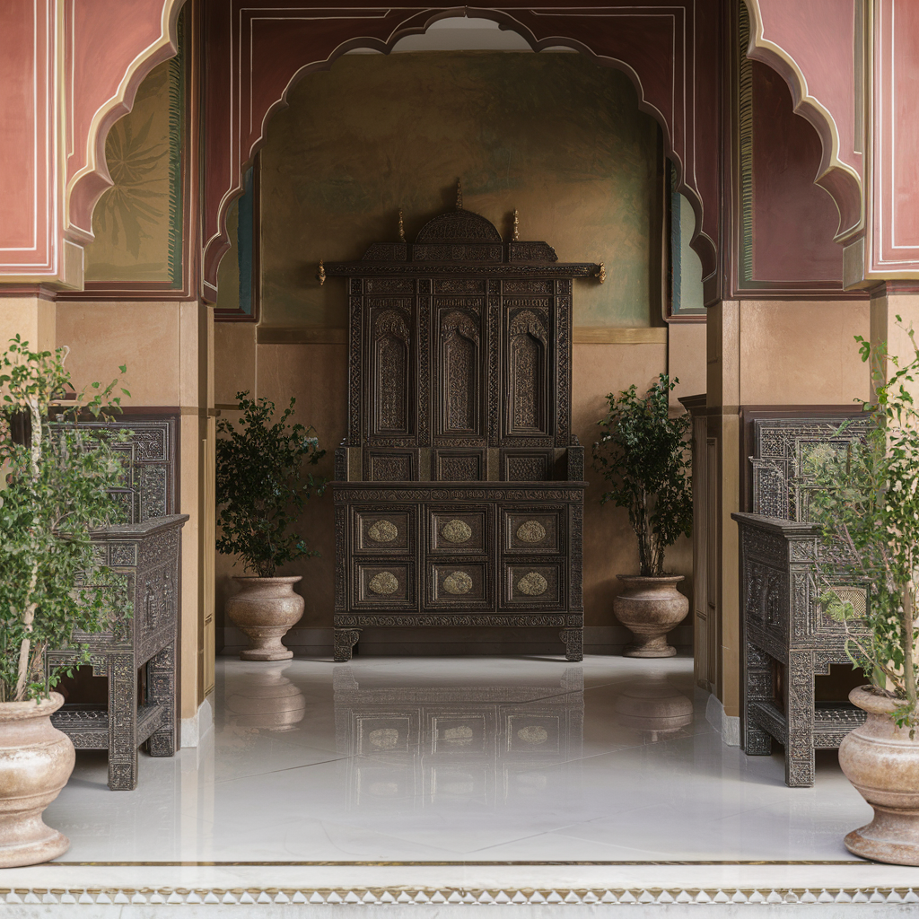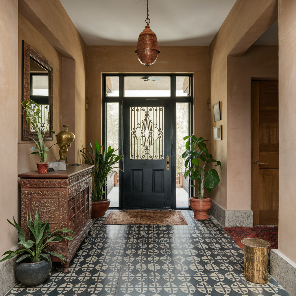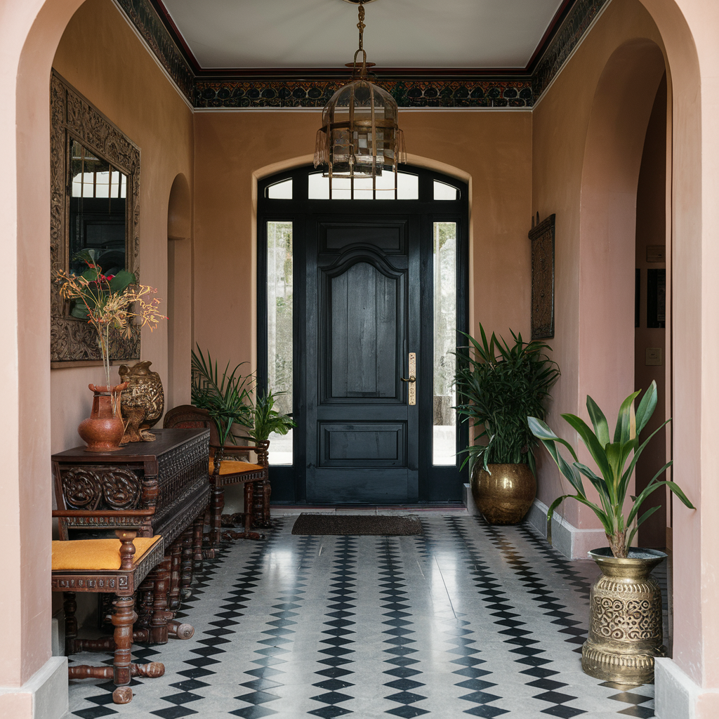 Adding Indian design features to your entrance hall can be a nice addition to its style and gives it an exotic flavor. Utilize visually striking patterns in floor coverings and wall hangings. Enlist genuine Indian furniture and include a teak wood cutting board and use a copper charger. You can also add small potted plants in strategic locations to help the placement.