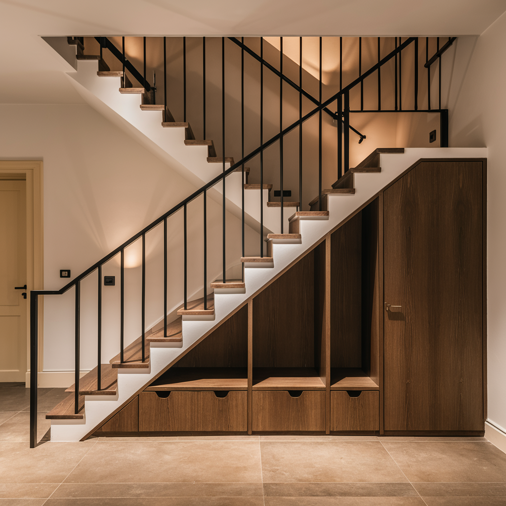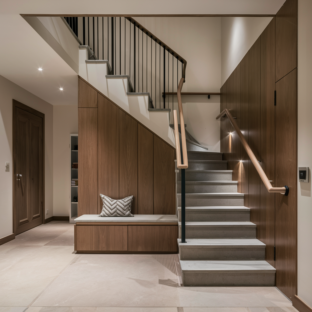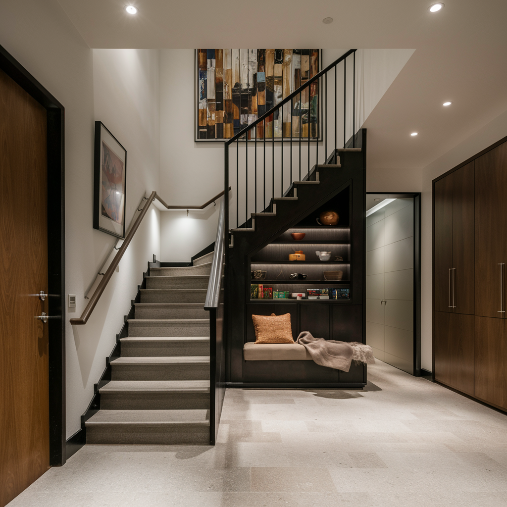 Integrating stairs in your entrance hall may even be the best spot that one can imagine for the same purpose. Use the space under the stairs for storage, such as built-in cabinet or shelf. A stylish handrail and appropriate lighting are the best ways to emphasize the staircase design. Think about open risers that will keep the lounge in a light and spacious atmosphere.