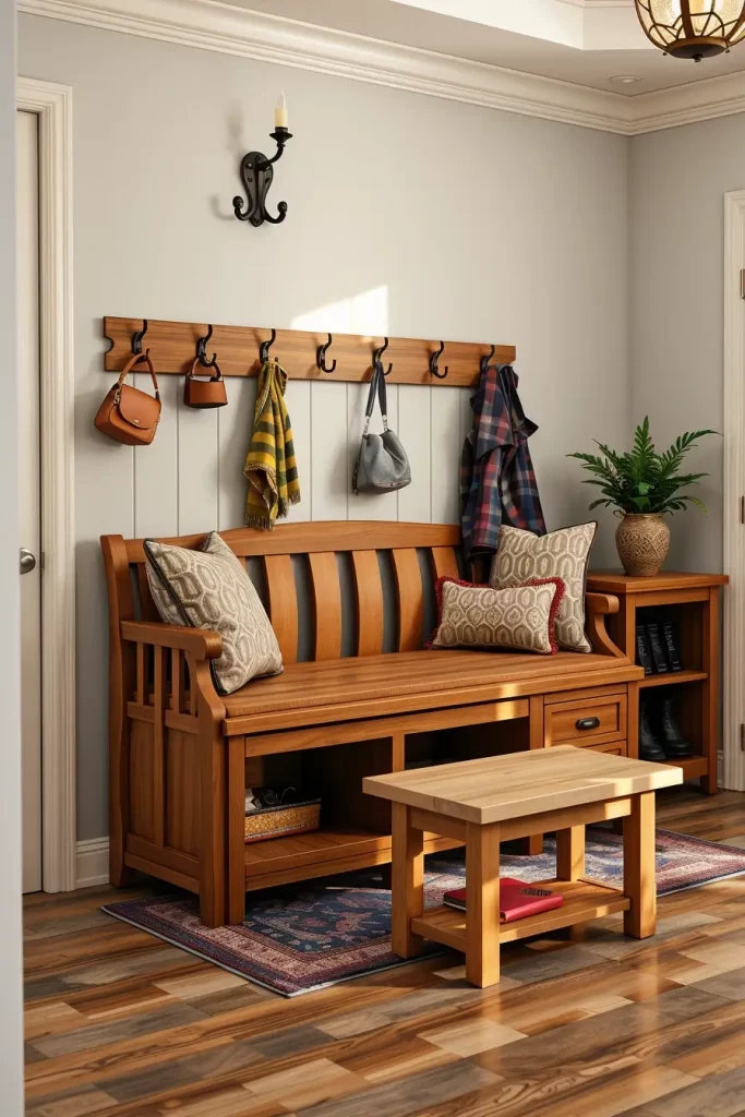 Choose a bench with a hinged seat and storage containers built under it. If you choose, the table can stand beside or joined to the bench, offering an easy place to store bags, shoes and seasonal items. I think cushions in either neutral or plaid prints make the area more inviting.