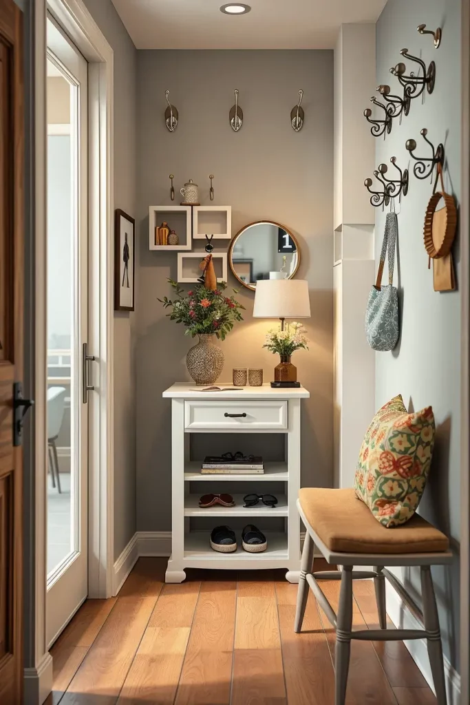 I have tried using a floating shelf with some wall hooks and a bench which gives me an entryway alternative. It’s an excellent buy when space is limited. Apartment Therapy recommends using wall-leaning tables or those shaped like half moons when space in your hallway is limited.