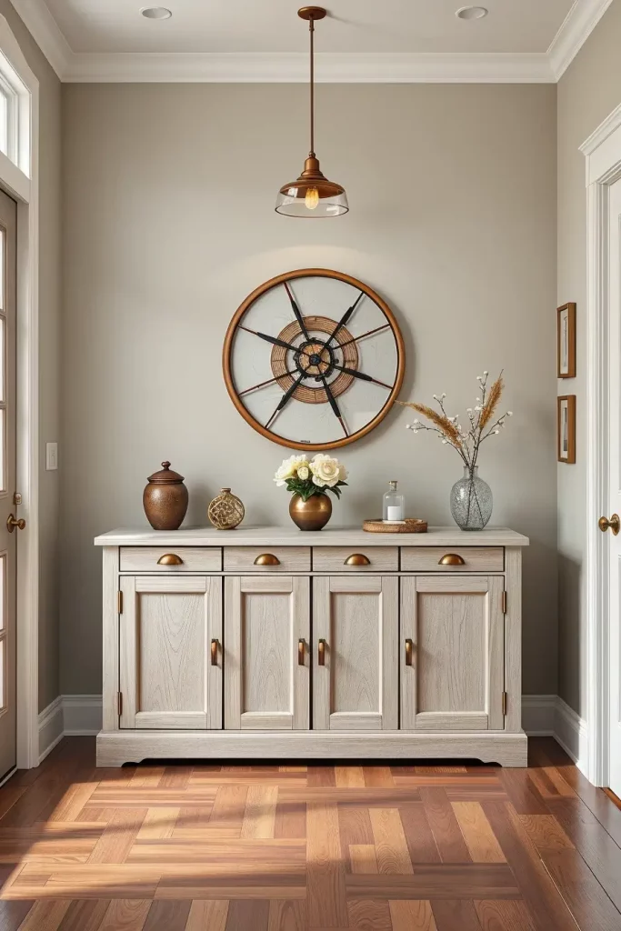 I’d also suggest putting a small chalkboard or message board above the table. It’s practical for reminders or notes, and it brings a cozy, family-friendly vibe to the space without crowding the table surface.