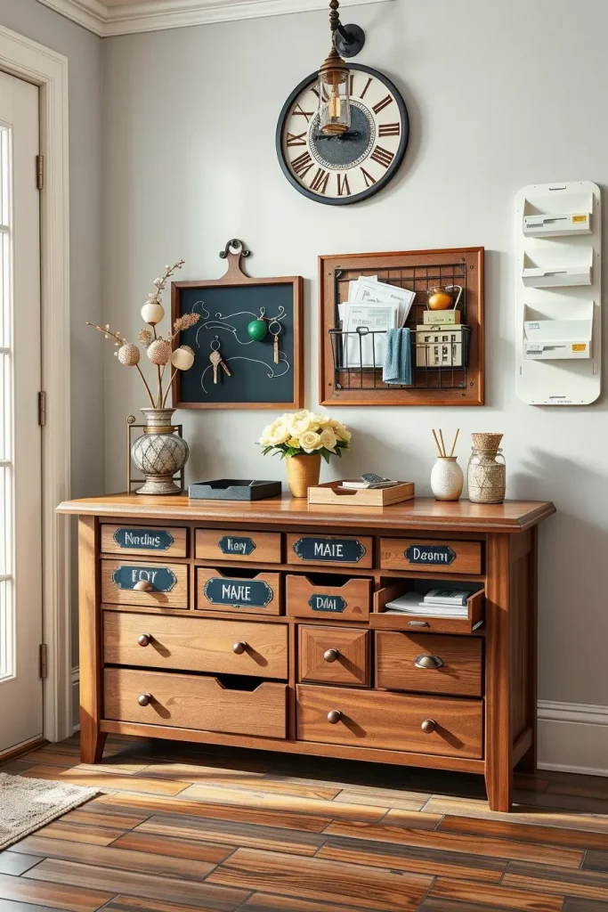 I suggest getting a console table with several drawers and either a chalkboard, metal minigame plates or engraved wood nameplates. Within the drawers, dividers can help you make sections for mail, to-do lists and receipts. There are models with built-in hanging files or document trays, so they’re suitable for people who work at home or in the office.