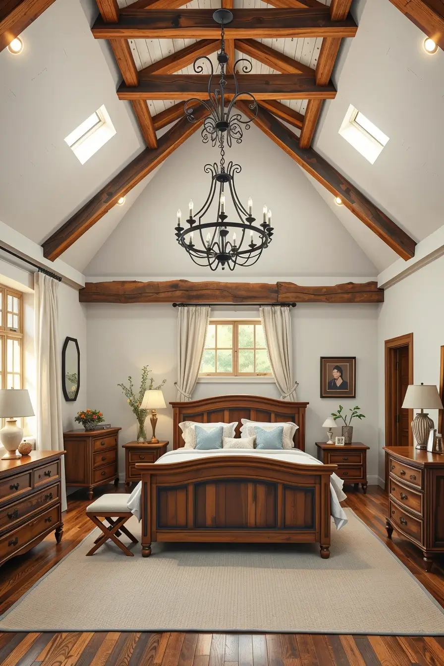 There are designs of furniture that cross over time. Starting with wooden or wrought-iron bed frame with clean lines, I would start working on a farmhouse bedroom. It can be supplemented with a worn-out dresser and a vintage-style nightstand as something that is authentic and yet functional.