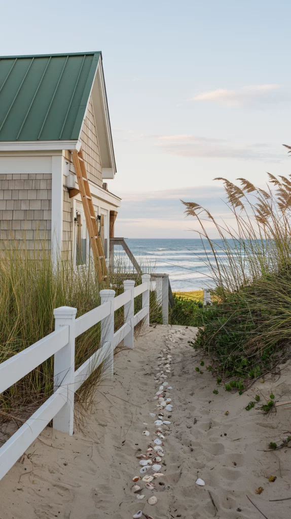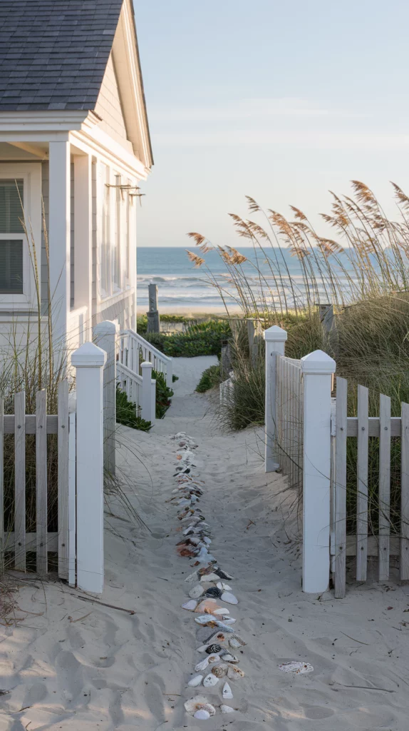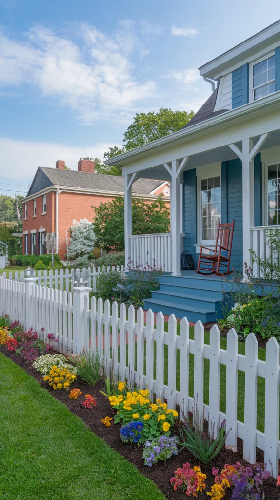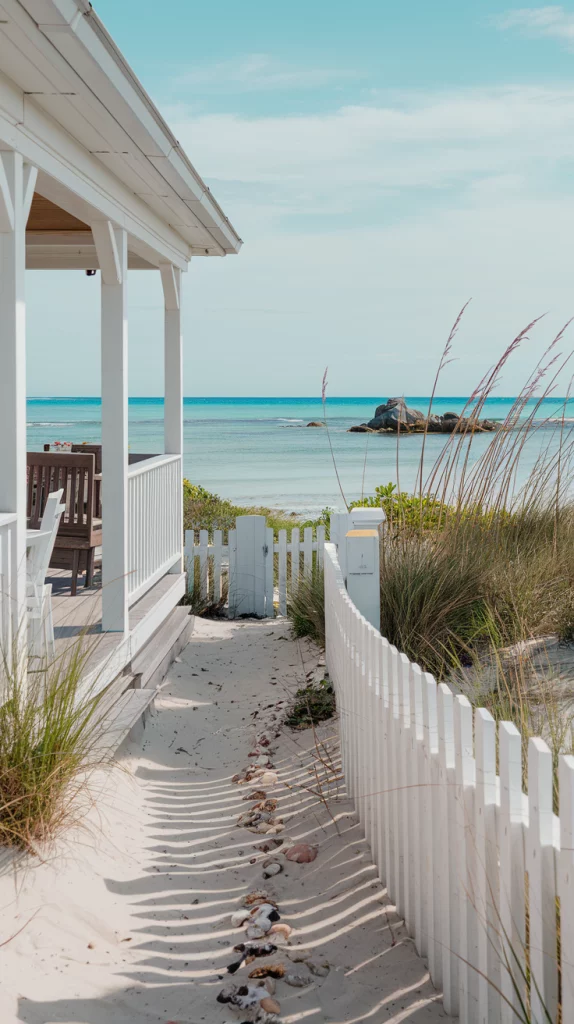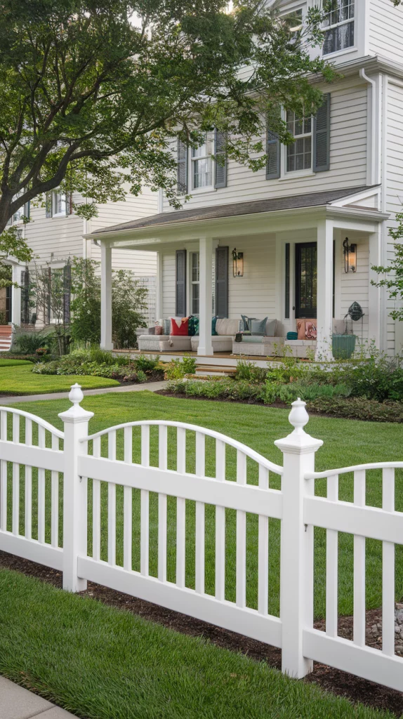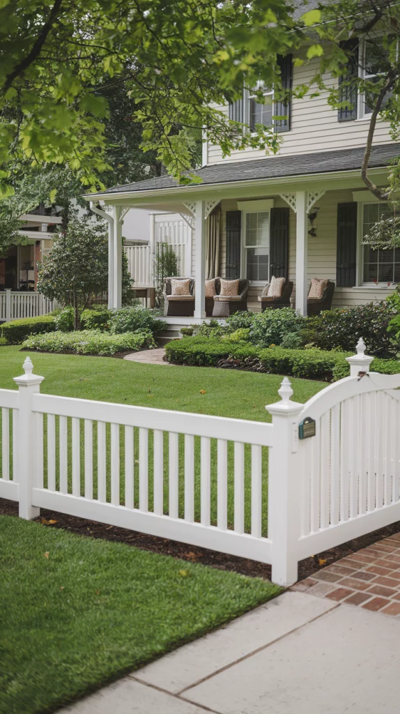 A coastal-style white fence is the perfect addition to beachfront properties, seaside cottages, or coastal-inspired homes. Typically crafted from weather-resistant vinyl or painted wood, these fences evoke a light and airy feel. Incorporating curved tops, lattice panels, or nautical rope accents enhances the coastal theme. Soft blue or pastel accents, along with dune grasses or seashell-lined pathways, complete the serene ambiance.