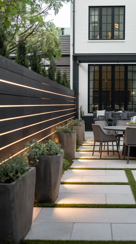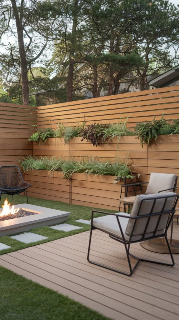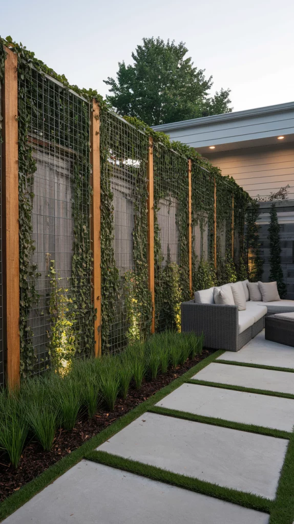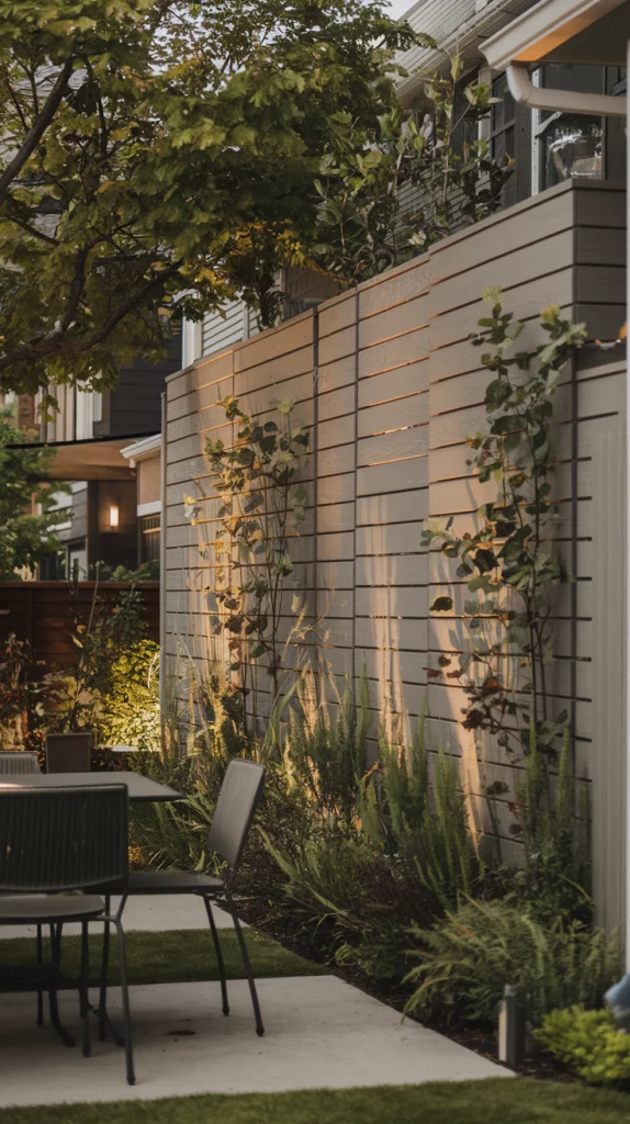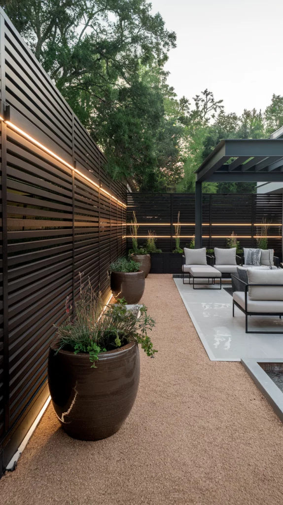 A slatted privacy screen fence offers both privacy and airflow, making it a stylish choice for urban and contemporary homes. These fences use wood or metal slats spaced strategically to create a semi-private enclosure that doesn’t feel completely closed off. Often paired with planters, outdoor lighting, or climbing greenery, slatted fences help define spaces like patios, decks, or backyards without feeling too confined.