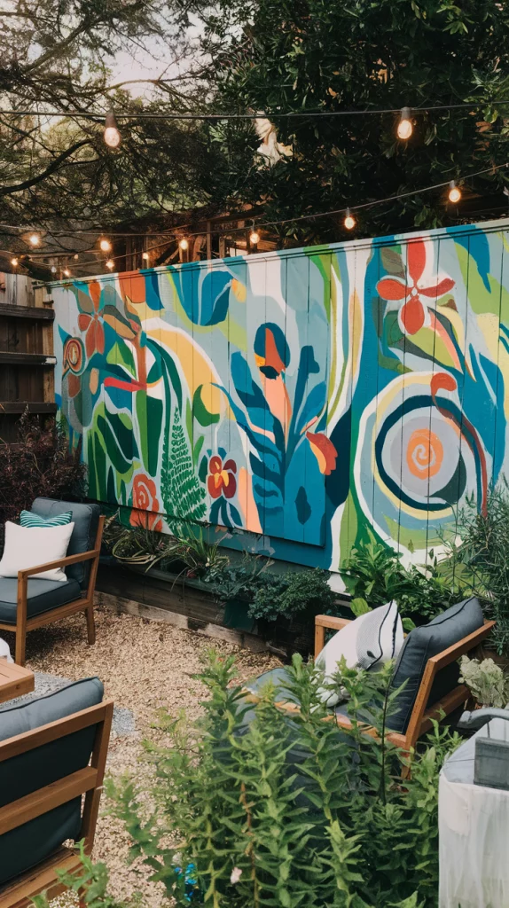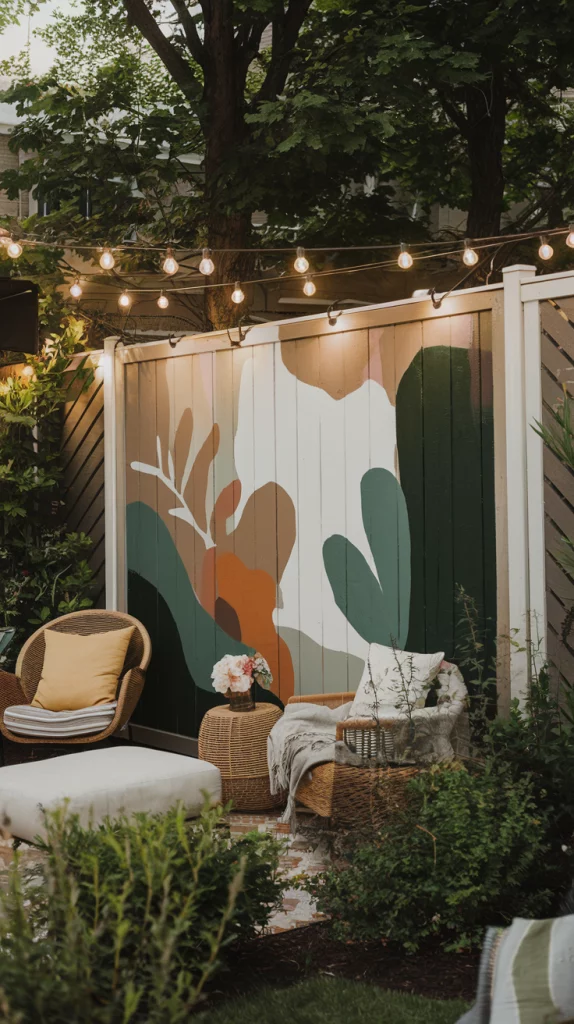 A fence mural transforms a plain barrier into a work of art, making it a perfect choice for creative homeowners and urban gardens. These murals can be hand-painted, printed panels, or stencil-based, allowing for a completely customized design. Nature-inspired scenes, abstract art, or cultural motifs work beautifully for mural fences. Adding outdoor lighting to highlight the artwork at night makes it even more striking.