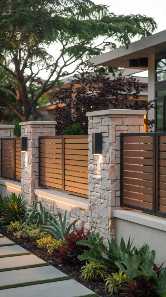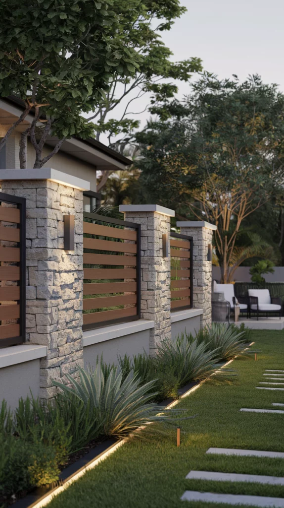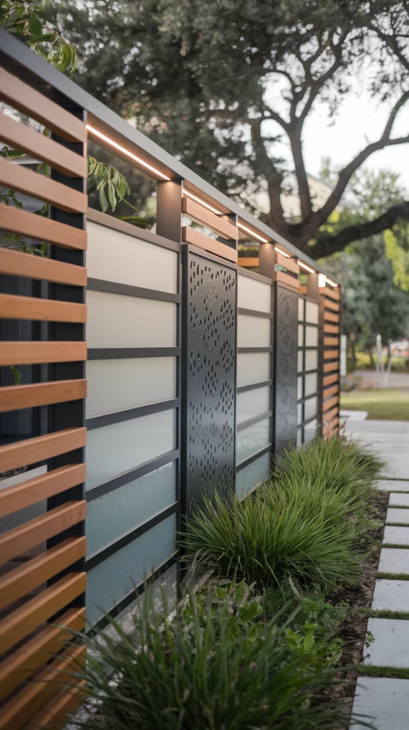 For a truly unique boundary, mixed material fences combine different elements such as wood, stone, metal, and glass. This approach creates a visually interesting, textured fence that complements a variety of architectural styles. Combining wood with metal slats, or stone pillars with glass panels, enhances durability while adding personality to the space. These fences are ideal for modern and eclectic homes looking for a standout feature.