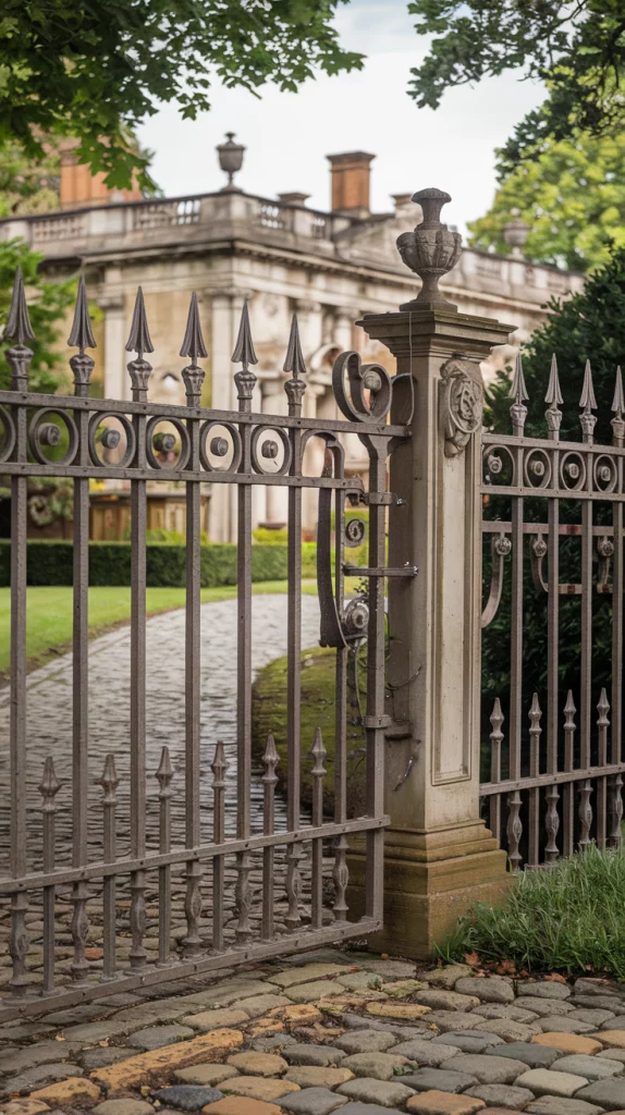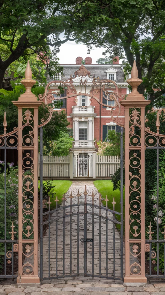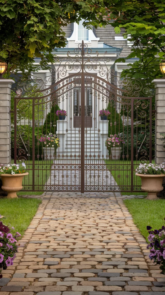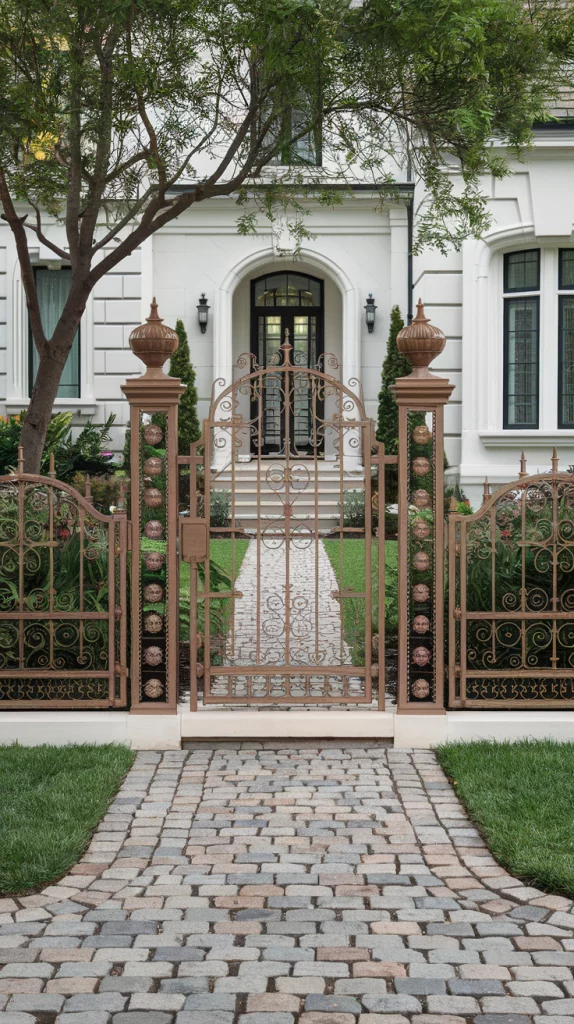 A decorative metal fence adds sophistication and security, commonly seen in wrought iron or aluminum designs. These fences often feature intricate scrollwork, geometric patterns, or modern minimalist lines. Adding matching gate designs and stylish finials can further enhance the elegant appeal.