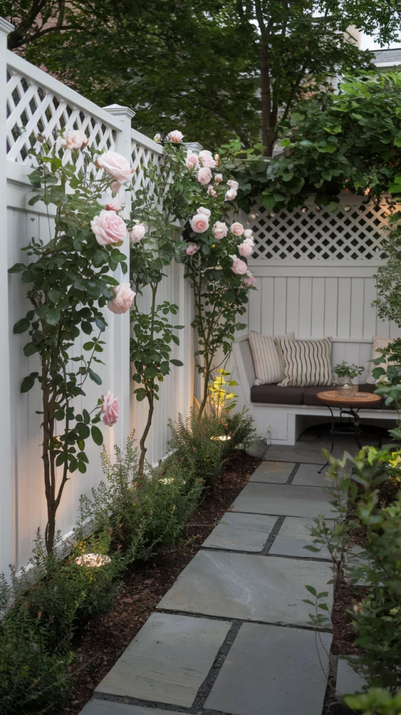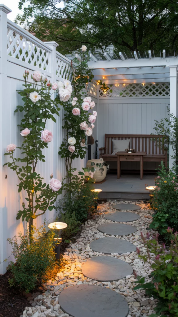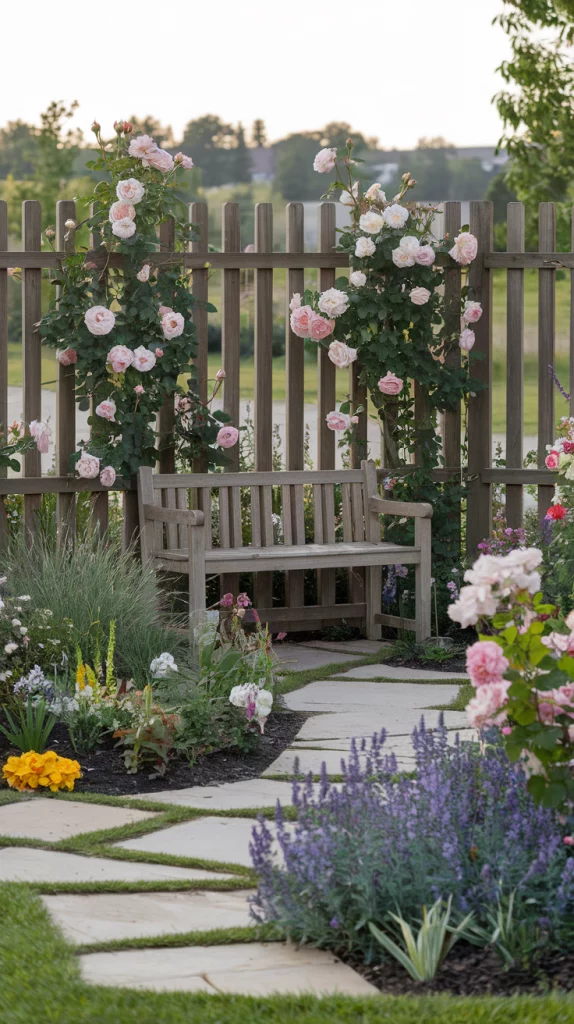 Lattice fences offer a decorative yet functional solution, perfect for garden enclosures or patio dividers. The crisscross patterns allow sunlight to filter through while still providing privacy. These fences look stunning with climbing roses, ivy, or string lights for a cozy ambiance.