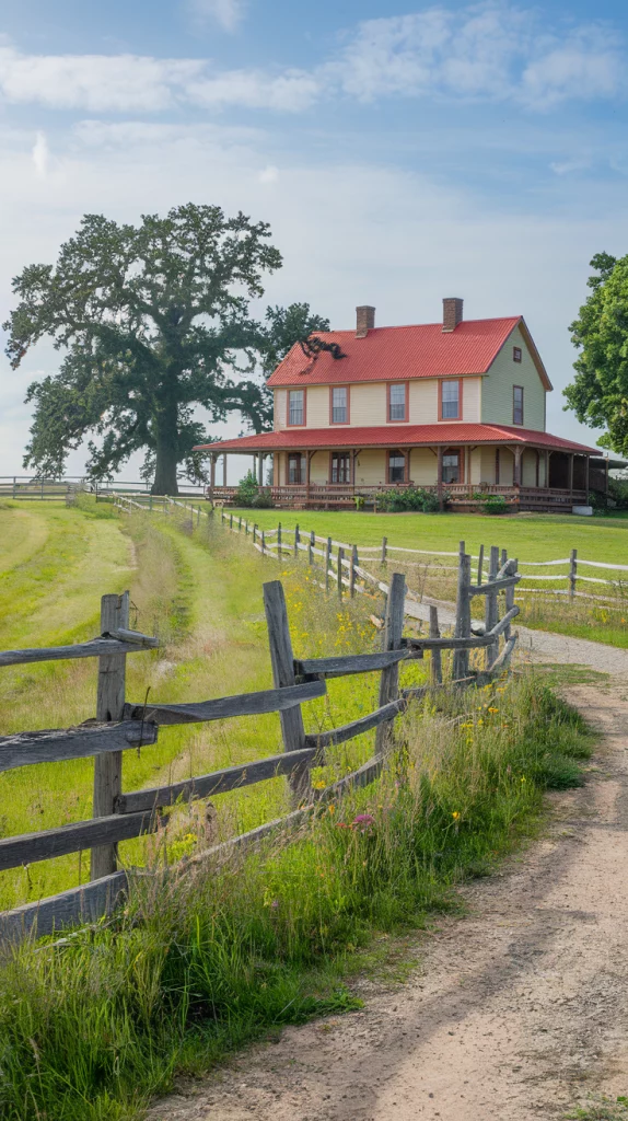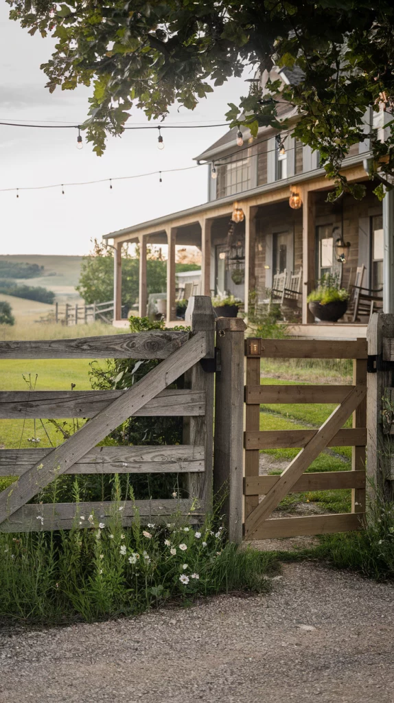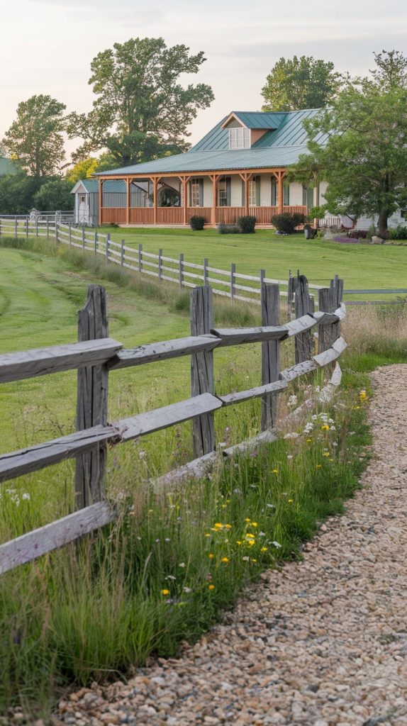 A split rail fence is a classic farmhouse design that offers a rustic, open aesthetic. Traditionally made of rough-hewn logs or wooden rails, this fence style is ideal for large properties, ranch-style homes, or country landscapes. While it doesn’t provide complete privacy, it defines property lines while maintaining an inviting feel. Adding wildflowers, gravel pathways, or rustic lanterns enhances the farmhouse charm.