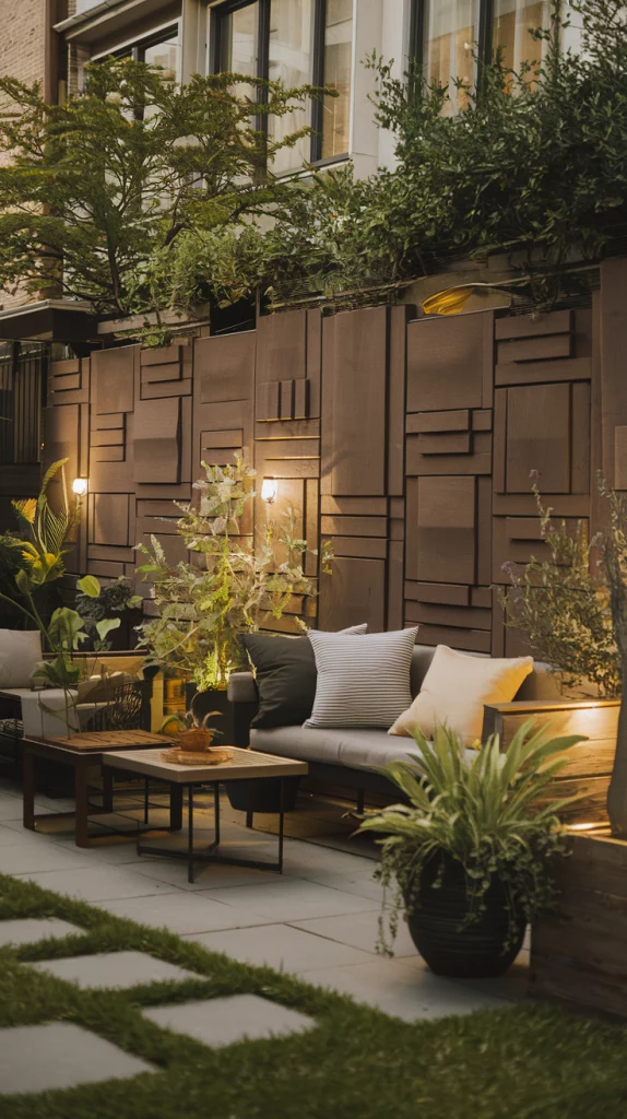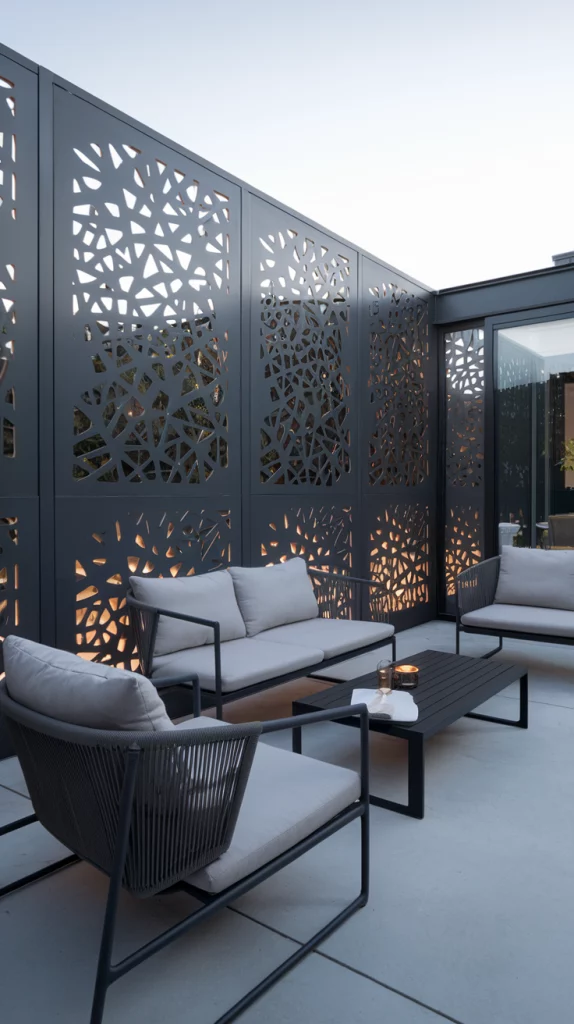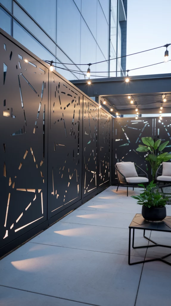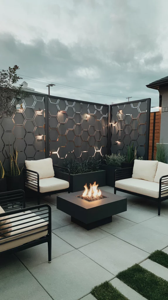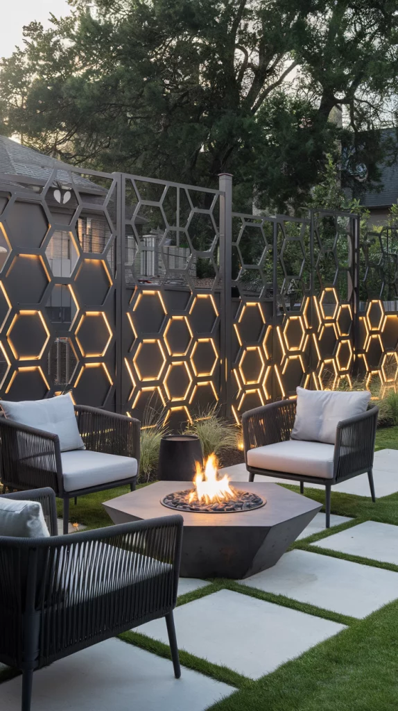 For a modern and artistic twist, geometric patterned fences make a bold statement. These fences use cut-out metal panels, wood carvings, or tile-like designs to create a visually engaging outdoor space. Whether it’s triangles, hexagons, or intricate latticework, the structured shapes add depth and uniqueness. Ideal for contemporary homes, these fences can be combined with LED backlighting or contrasting colors for an even more dynamic appearance.