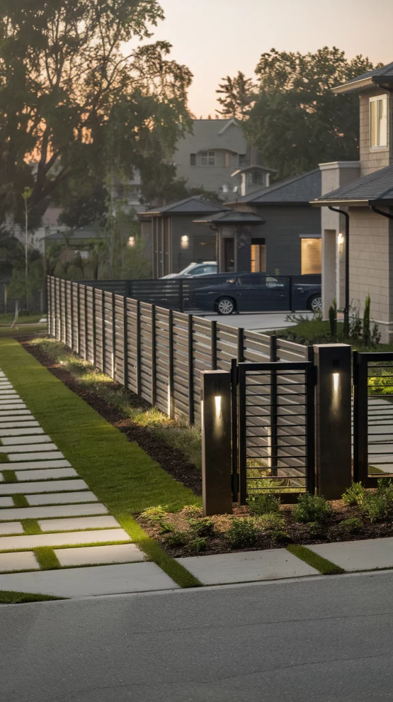 A modern horizontal slat fence offers a sleek and contemporary look, perfect for minimalist outdoor spaces. These fences are often made of wood, metal, or composite materials, creating clean, linear aesthetics that complement modern homes. Their open slat design allows airflow and visibility while maintaining privacy. Pairing these fences with LED lighting or decorative planters enhances the modern vibe.