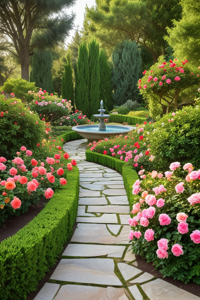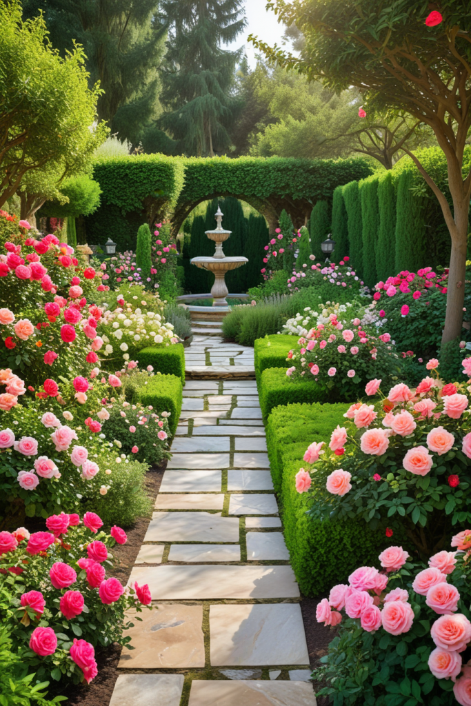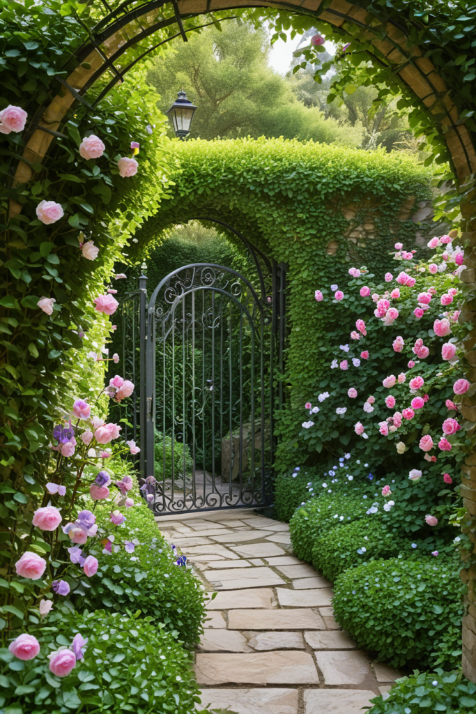 A secret garden offers a private, enchanting escape, hidden within a larger landscape. Create a secluded space using hedges, trellises, or ivy-covered walls to enclose the area. Winding paths leading to hidden nooks with seating, statues, or fountains enhance the feeling of discovery. Planting roses, foxgloves, ferns, and violets adds a whimsical touch, while arched entryways covered in climbing flowers create a magical entrance.