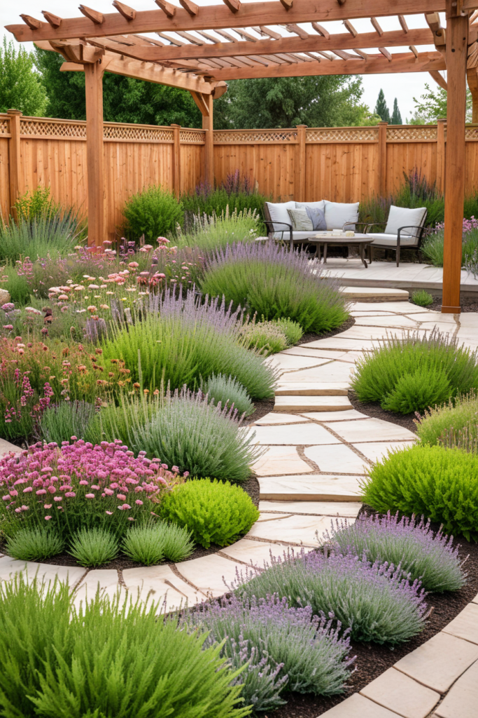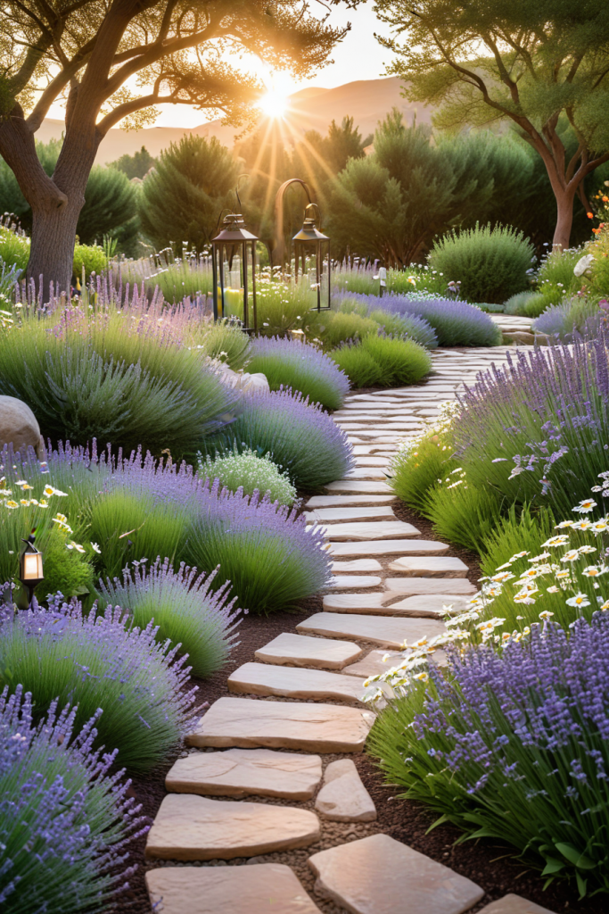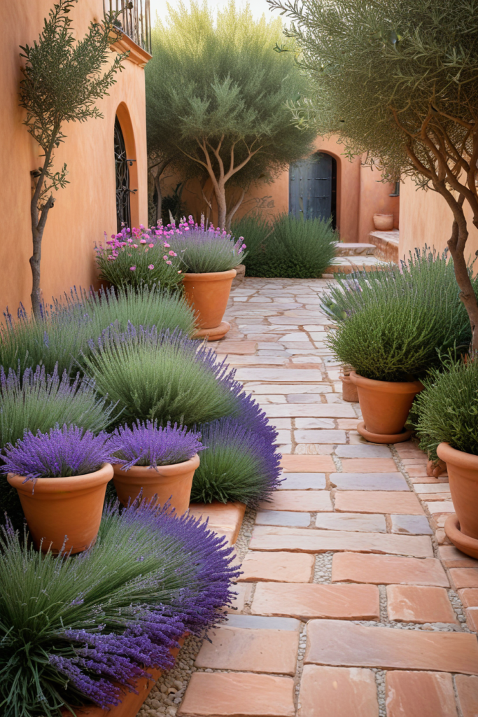 A Mediterranean-style flower garden embraces warm, sun-loving plants and structured landscaping. Incorporate olive trees, lavender, rosemary, and bougainvillea to achieve the signature Mediterranean look. Use terra cotta pots, stone pathways, and wrought-iron garden furniture to enhance the rustic charm. Drought-resistant flowers like agapanthus and red valerian thrive in this style, adding splashes of color against neutral-toned stonework.