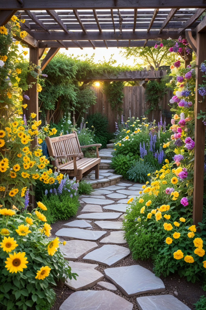 Transform your backyard into a serene floral retreat by incorporating a mix of lush perennials, shaded seating areas, and decorative elements. Layered flower beds with tall sunflowers, medium-height peonies, and ground-covering alyssum create depth and texture. A cozy wooden pergola draped in wisteria or climbing roses, along with a rustic garden bench and ambient lighting, enhances the peaceful ambiance. For a more enclosed sanctuary, use hedges or trellises to create a sense of privacy.