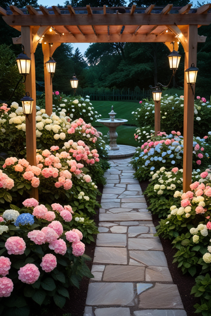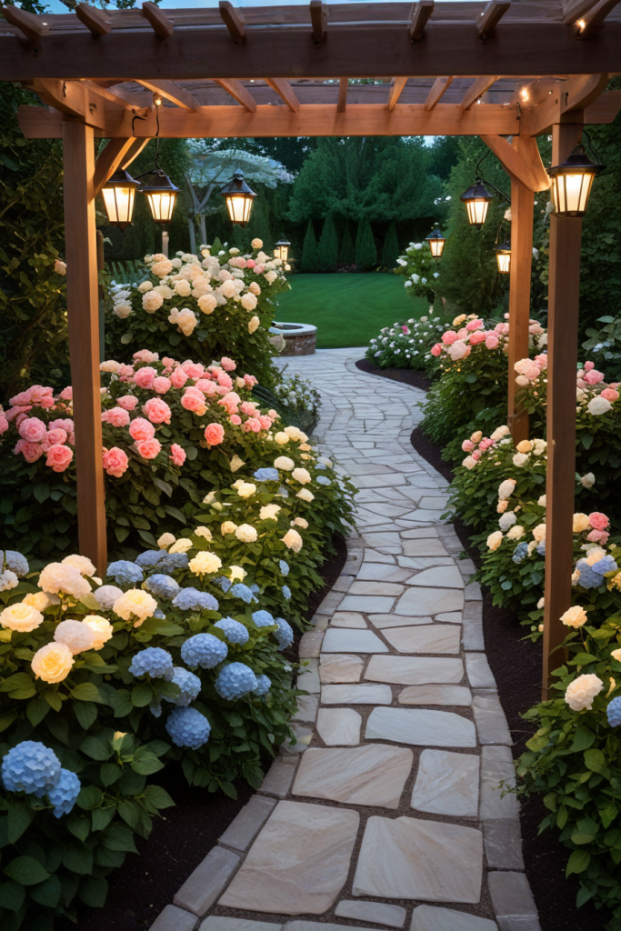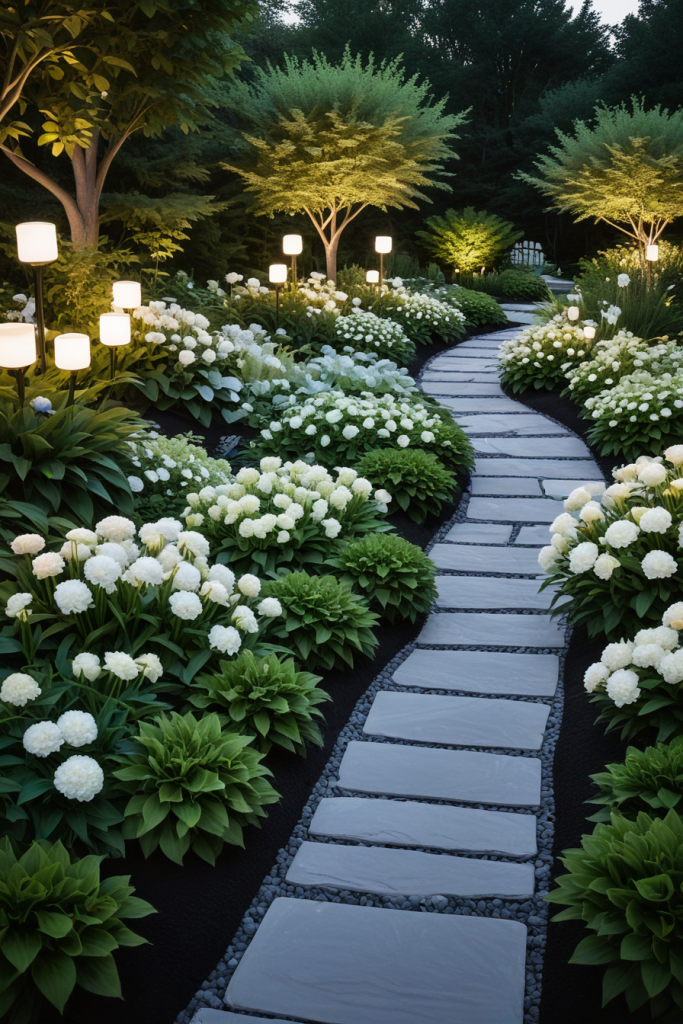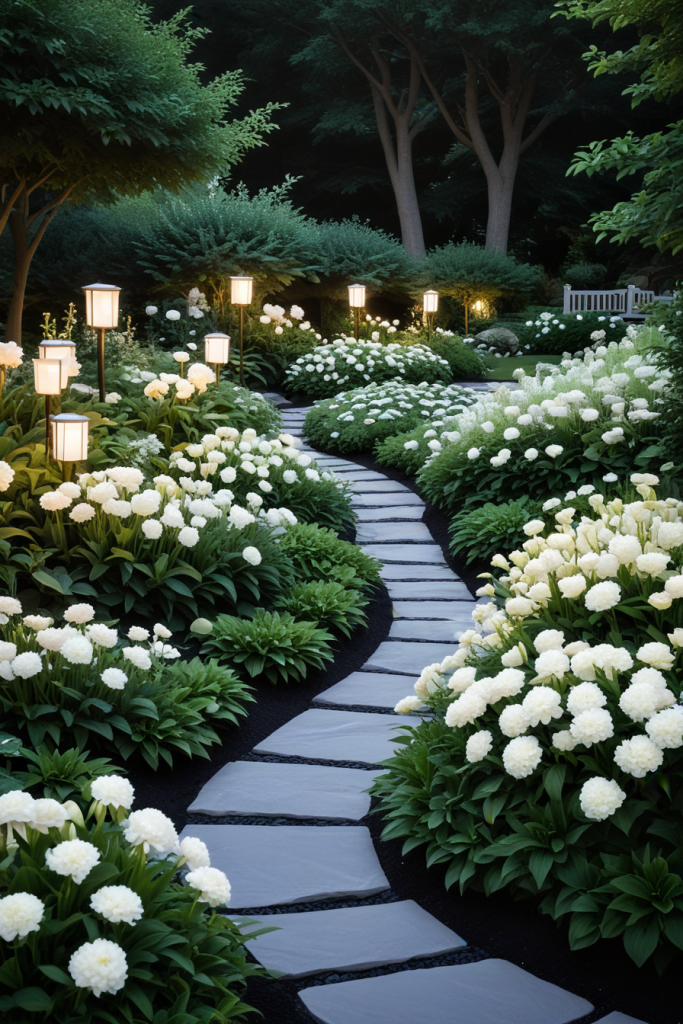 Soft lighting transforms a flower garden into a magical evening retreat. Use solar-powered lanterns along pathways, string lights draped over pergolas, and spotlights highlighting key floral displays. Subtle ground-level lighting enhances the texture of flower beds, while LED-lit fountains or lantern-lit seating areas create a romantic glow.