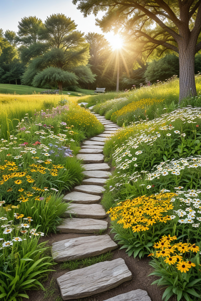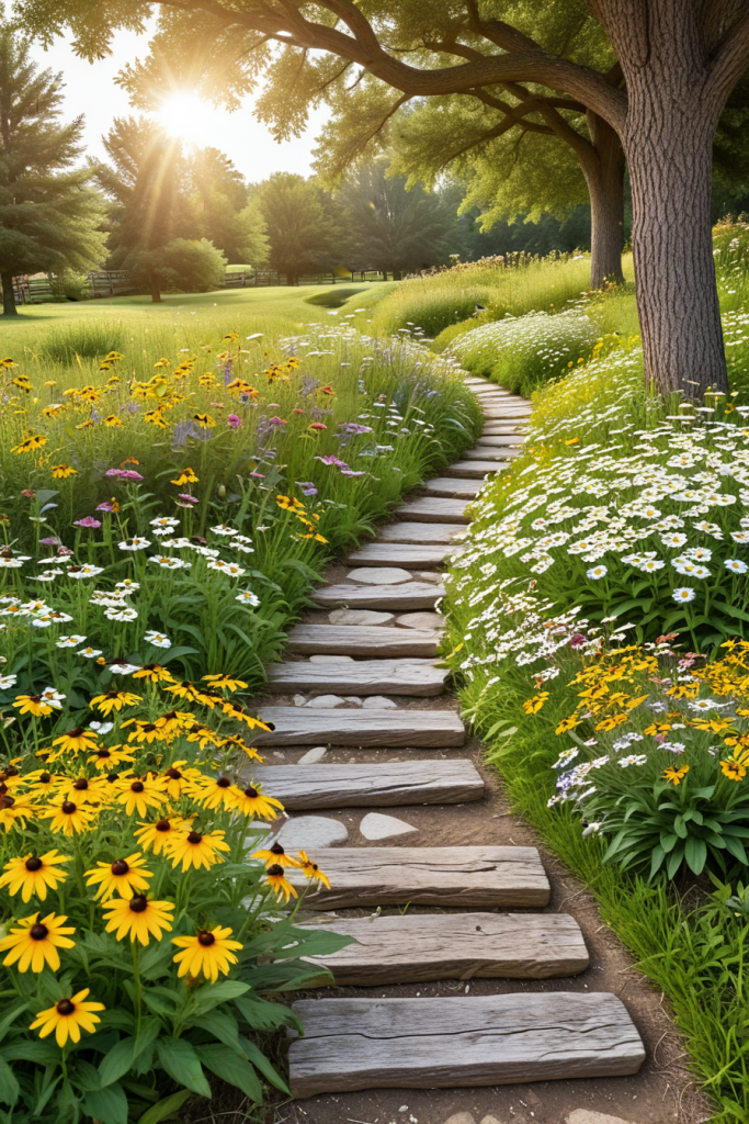 A wildflower garden embraces a natural, untamed beauty by featuring native plants, open meadows, and minimal structuring. Flowers like black-eyed Susans, daisies, coneflowers, and poppies thrive in free-form arrangements, creating a habitat for bees, butterflies, and birds. Adding natural wooden fences, small stepping stone trails, and a birdbath enhances the wild, serene atmosphere.