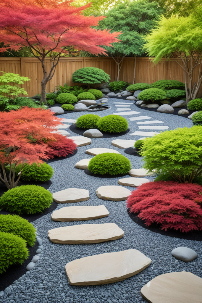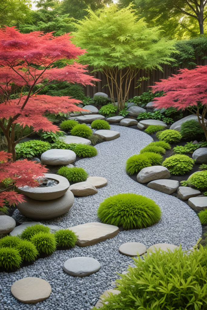 A Zen flower garden combines minimalism, symmetry, and natural elements to create a peaceful retreat. Use Japanese maples, azaleas, bonsai trees, and ornamental grasses for an authentic touch. A gravel or raked sand area, accented with large stepping stones and a koi pond, enhances the tranquil aesthetic. Bamboo water features and stone lanterns complete the serene atmosphere, making it a perfect place for meditation.
