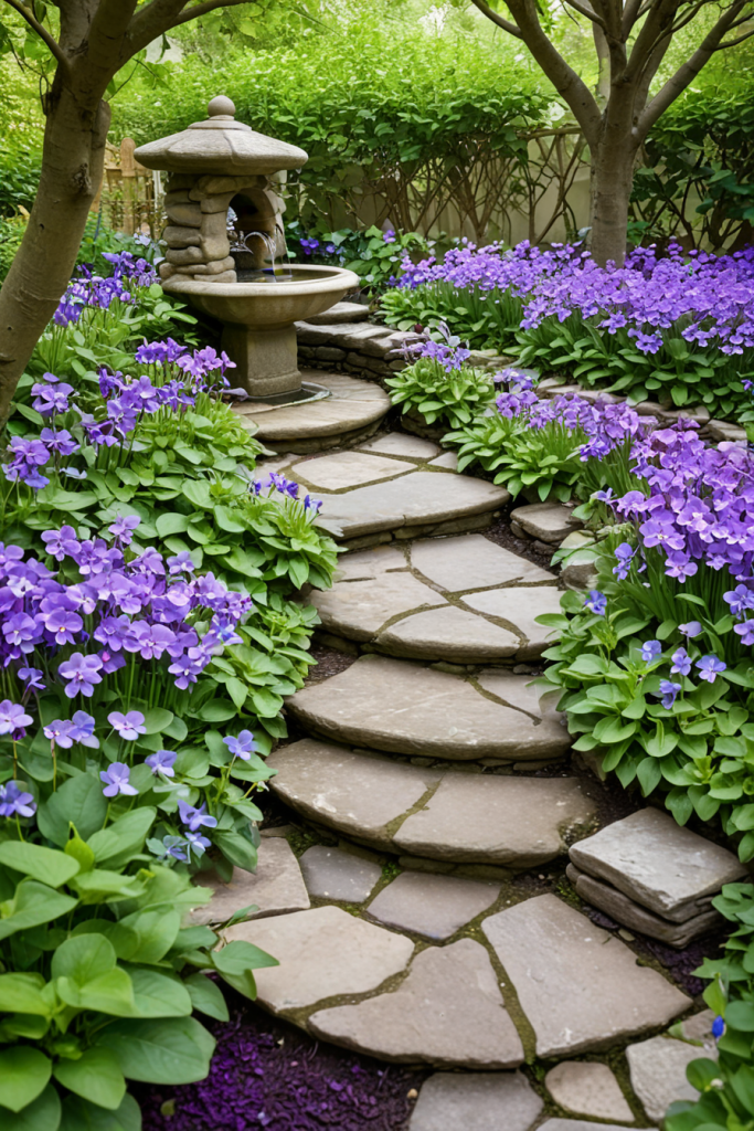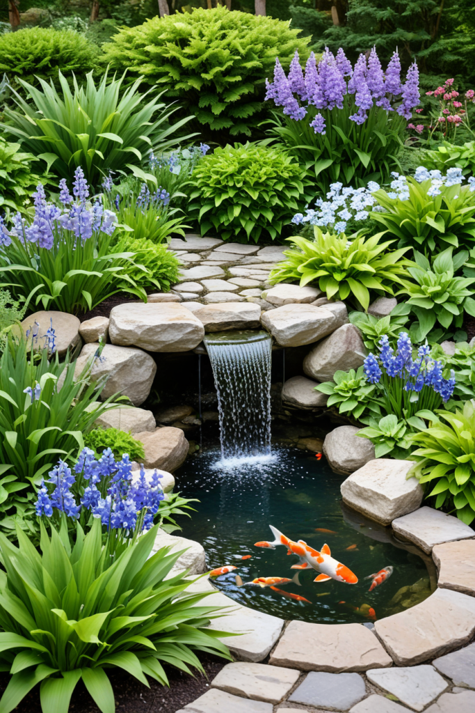Adding water features to a flower garden enhances its serenity and visual appeal. A small koi pond surrounded by irises and water lilies, a cascading waterfall framed by ferns and hydrangeas, or a birdbath nestled among lavender and daisies creates a peaceful retreat. Reflective pools with floating blooms like lotuses add an element of elegance, while solar-powered fountains provide soothing sounds that attract birds and butterflies.