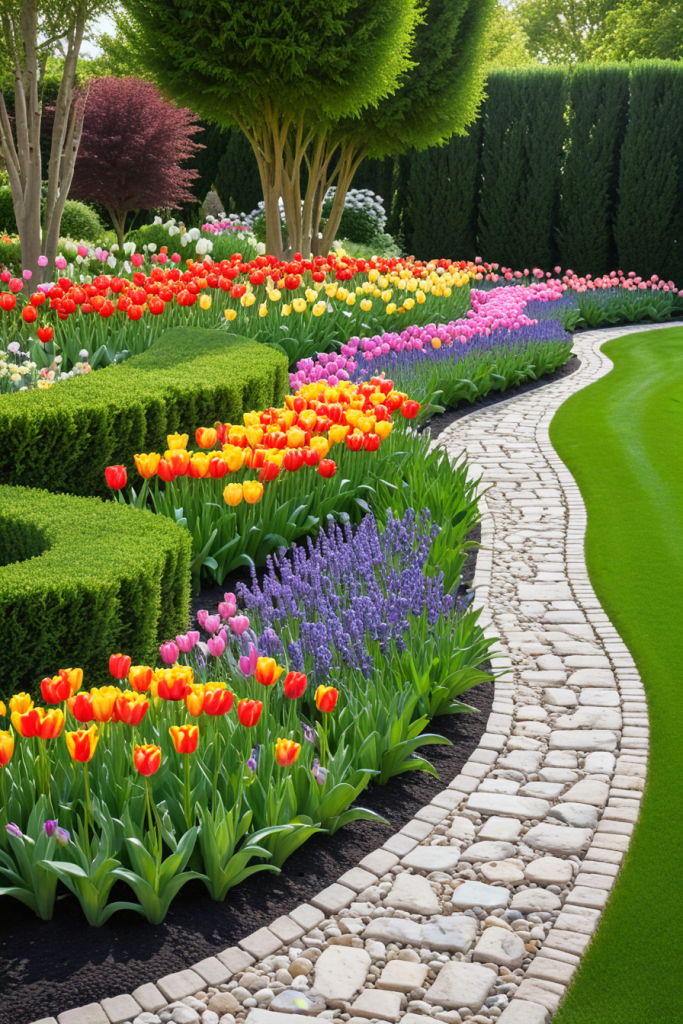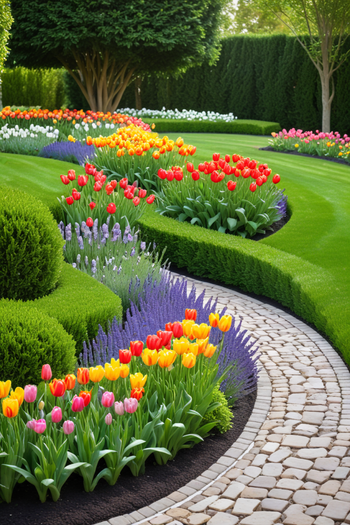 A well-designed flower garden border provides a transition between different sections of a landscape. Use tall perennials like hollyhocks or foxgloves at the back, mid-height plants like roses or peonies in the center, and low-growers like alyssum or creeping phlox at the front. Layering different textures and heights creates a soft, natural effect, while symmetrical borders with trimmed hedges give a formal, refined appeal.
