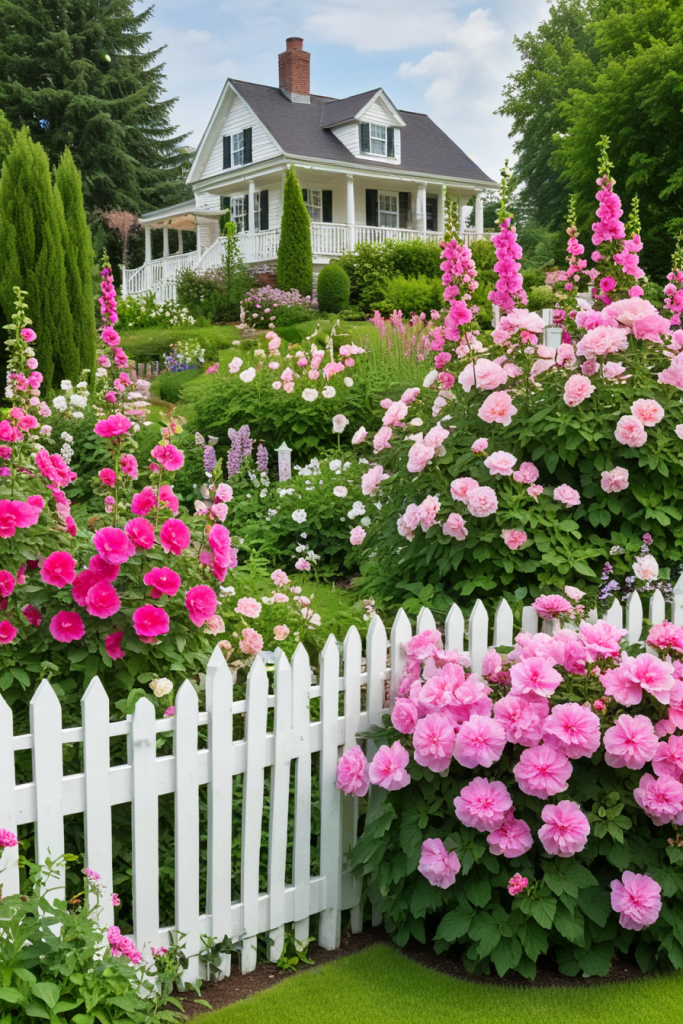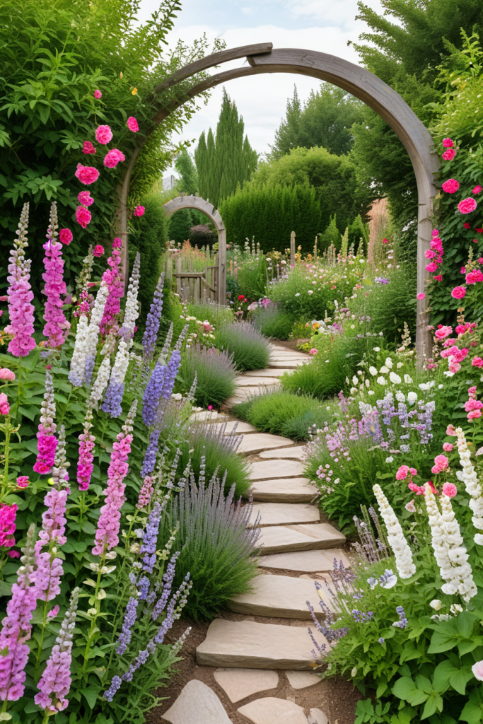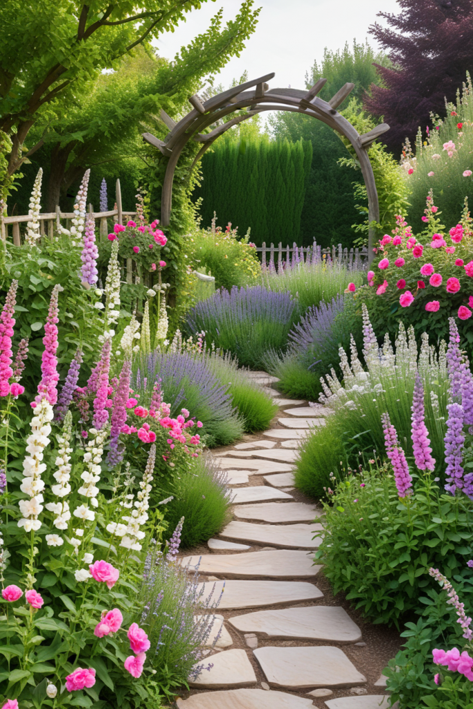 A cottage-style flower garden is known for its charming, whimsical appeal with a mix of wildflowers, climbing vines, and overflowing flower beds. This type of garden thrives on a relaxed, unstructured layout, featuring classic flowers like lavender, hollyhocks, foxgloves, and peonies. A winding stone path, wooden archways covered in climbing roses, and a cozy seating area enhance the romantic ambiance.